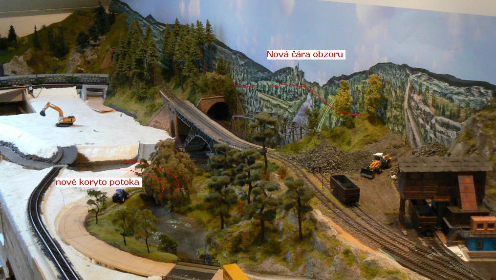 vím, jak bolestný je pro modeláře proces přestavby už hotové části krajiny. Snažil jsem se proto u svého návrhu tyto zásahy pokud možno minimalizovat. Je přece škoda tak krásný dvoukolejný most nechat na místě, kde na něj není vidět. Na fotografii jsem vyznačil můj původní úmysl. Mosty jsem přenesl na zdvihací díl a na jejich původní místo zakryl strmým svahem, který by zároveň opticky zakryl původně namalovanou řeku a skryté koleje vespod. Totéž na druhé straně. Vysoký ocelový most na lokálce pak vede přes strž, kde "geologické podmínky" (třeba podmáčený suťový svah) nedovolily nasypat násep.