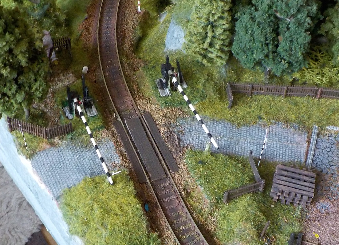 Co se týká šraněk, tak kříže považuju za dopravní značku, byť tenhle názor není košer. Celkově se šraňky budou ještě masivně dodělávat, aby aspoň z dálky lehce upomínaly na realitu. To zahrnuje vyvážení, aby šly dobře dolů i nahoru; celkové přebarvení, nakašírování spouštěcí mechaniky jak u šraněk, tak kliky u vechtru, imitaci zvonkového zařízení a nakonec i doplnění toho "dopravního" značení. A zase bude limitované budoucností - dvojjazyčně popsané černobílé, nebo červenobílá klasika?