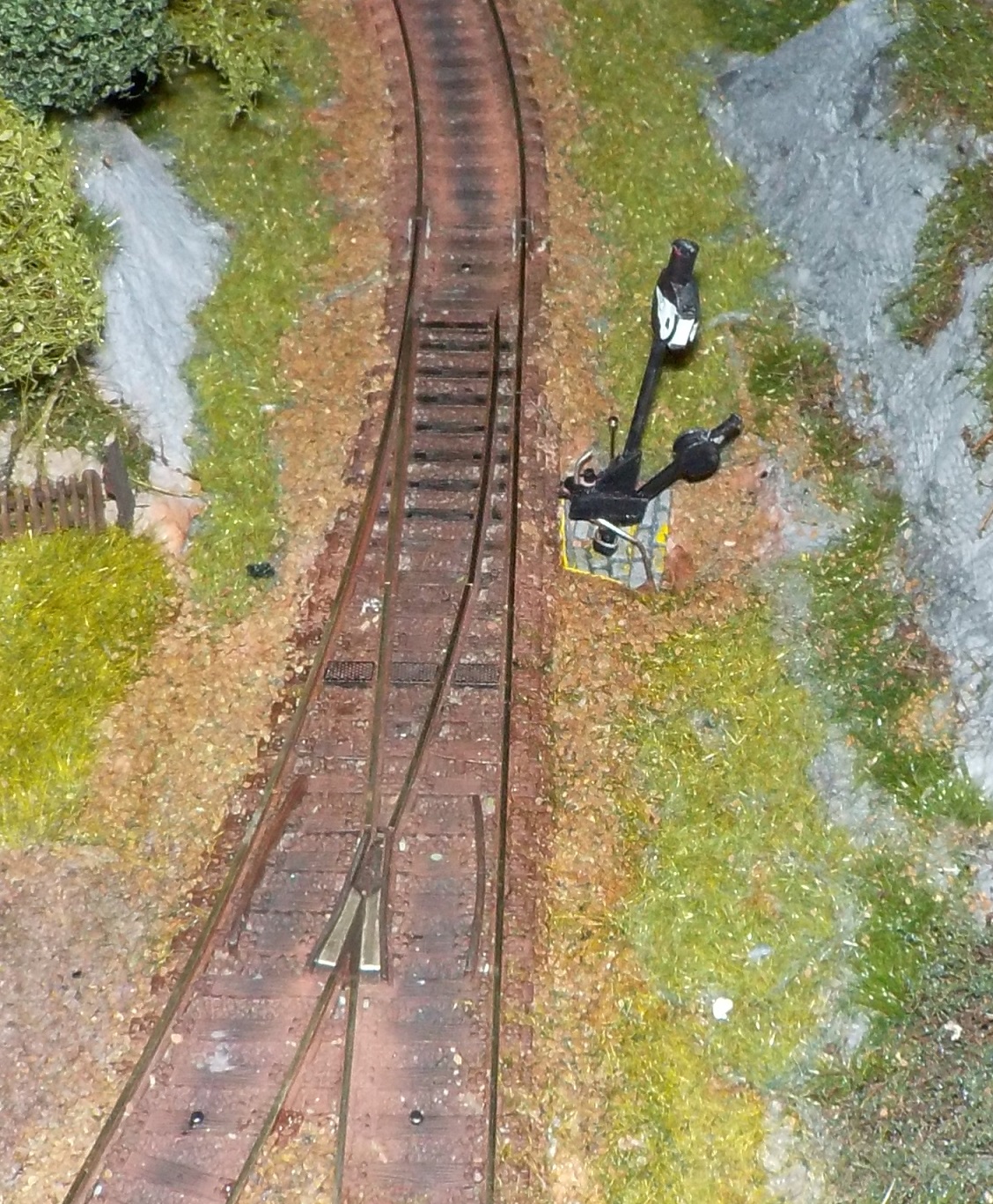 Výhybka - ta ještě čeká na dokončení a pro formu jsem se ještě nerozhodl (pevná imitace přestavníku, nebo funkční?). Zatím jsem rád, že to ruční přehazování bowdenem jde konečně hladce, ale spojení táhla výhybky s drátem bowdenu budu muset nějak zamaskovat. S tím se pojí i řešní výhybkového návěstidla.