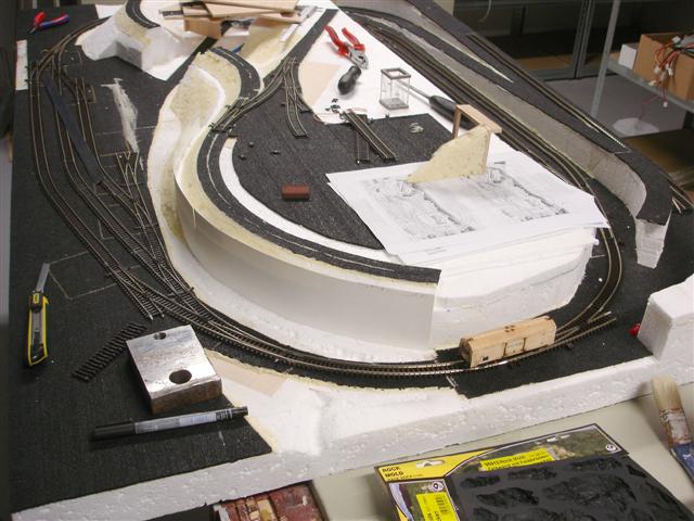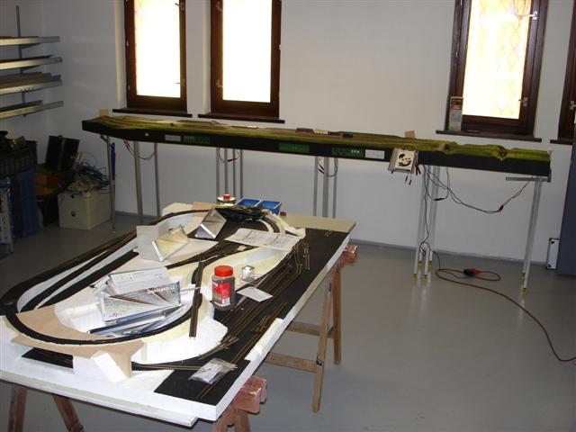 Z počátku mnoho fotek nebude. Další dám, až položím koleje. Pak se spolu s tím začne řešit i kulisa a dovršení terénu včetně horních tunelů, tak to pak bude zajímavější. Nicméně to chci udělat co nejdřív, protože boky kolejiště se musí co nejrychleji oplácat překližkou. Polystyrenové okraje základu dost trpí a taky se vzhledem k pokládce kolejiva musí zamezit veškerým průhybům základu.