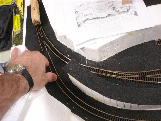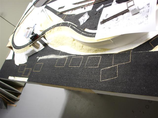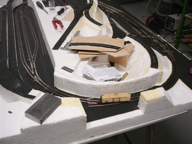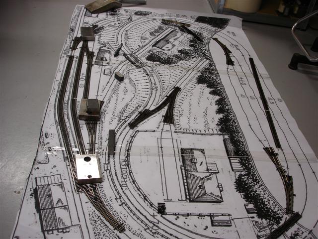 Koleje skládám přímo na plánku 1/1. Zdá se to být nejlepší varianta. Vše si sekládám nejprve nasucho. Pak proletuju mezi sebou větší celky a nakonec vše sestavím na platu, na kterém jsem si před tím vyznačil polohy přestavníkových dutin.