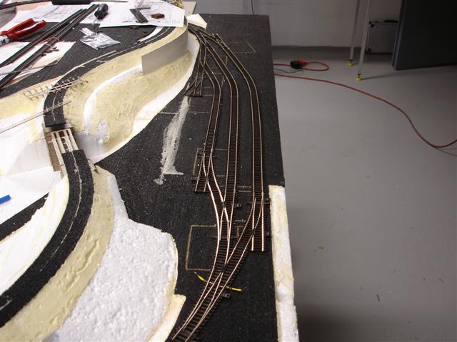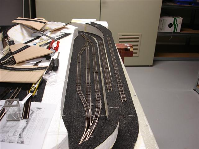 Koleje jsou samozřejmě pořád jen položeny na sucho. Lepit je budu až po oplácání bočnic kolejiště překližkou. Jinak by při manipulaci s kolejištěm hrozily průhyby a deformace kolejiva. Řeknu vám, pěkná pakárna trefit na desetinu délku prutů tak, aby po celém obvodu ve všech spojích na sebe pruty doléhaly a nebyly tam škvíry a přitom polohy výhybek a kolejí byly správně.