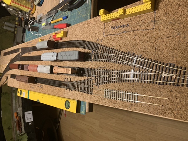 Stanice je postavena ze zásob. Použil jsem staré výhybky Pilz, ze zásob. Jednak kvůli tomu abych je rozumně zpracoval, jednak kvůli geometrii, která umožňuje provést zhlaví na celkem malé délce. Jen jsem nemohl strávit kloubové jazyky a původní srdcovky z podivné slitiny, tak jsem se pustil do úprav. Vyrobil jsem nové srdcovky i jazyky, přestavníky budou motorické od MTB. Trochu jsem upravil i poloměry zejména u obloukových výhybek. poloměry jsou nyní cca 600 mm.