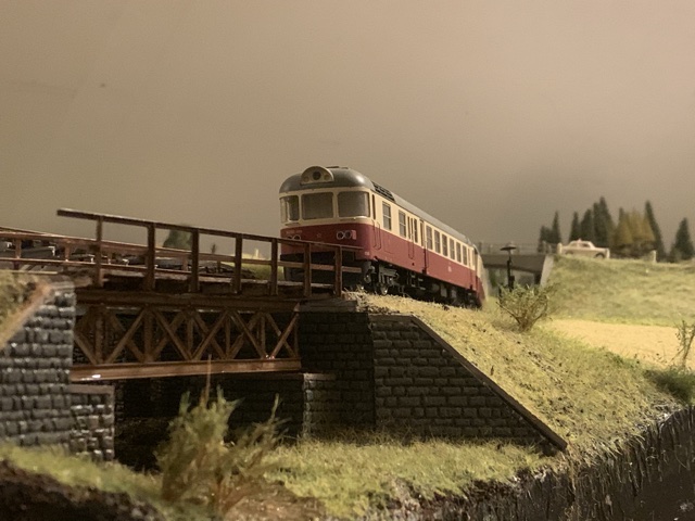 Borovice jsou včera dodělané, až jich bude víc (aspoň 10) začnu s lesíkem na skalce nad potokem, která je vidět na fotkách s přejezdem. Dole je pásmo dubových a borových lesů na pískovcích, u koncové stanice v horách už převládají smrky.