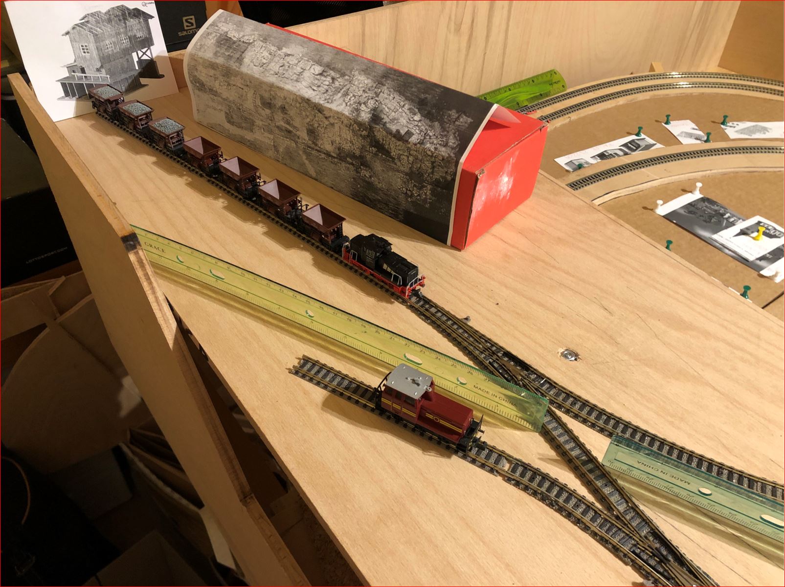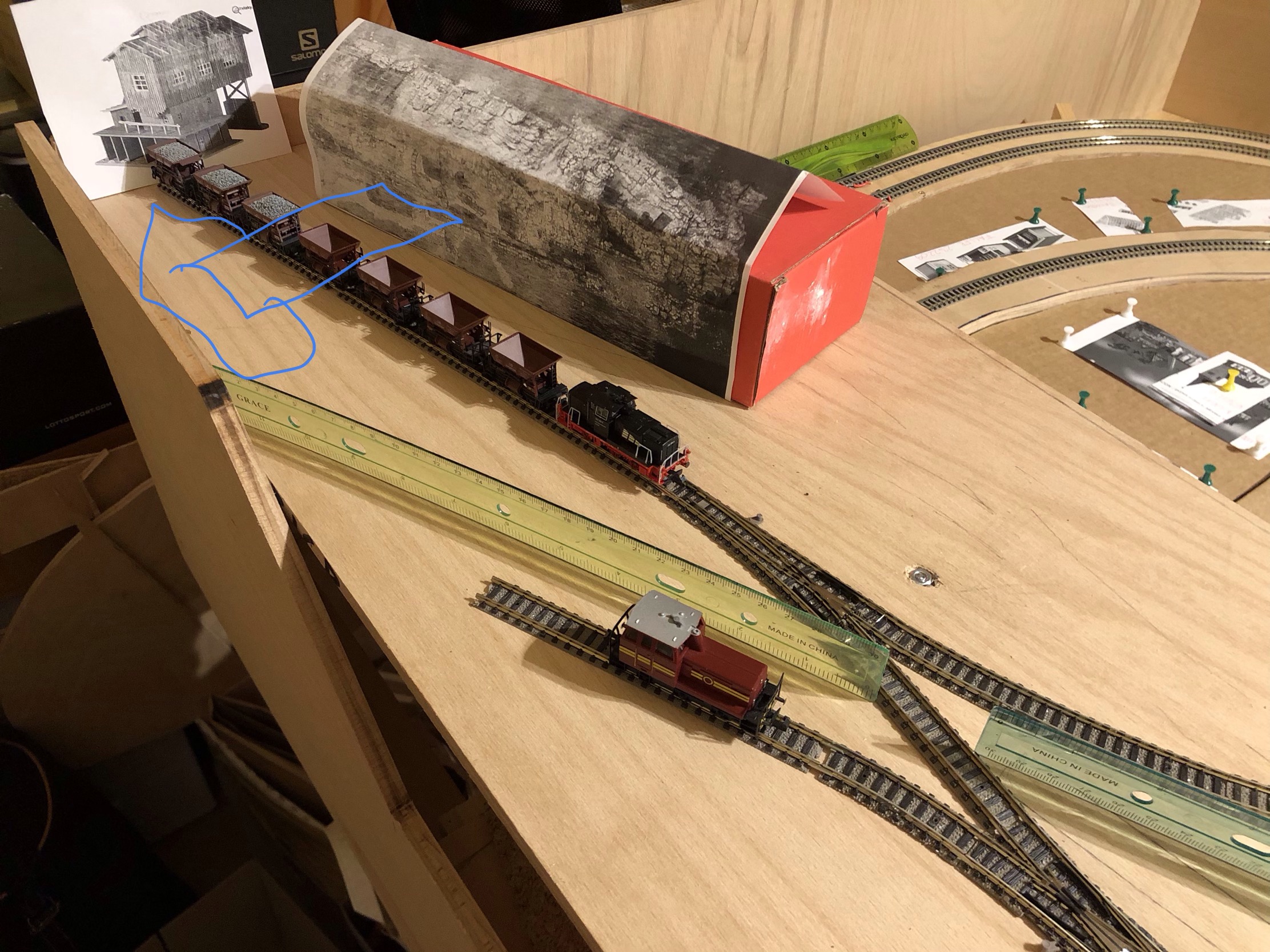Psal jsem již dole, že budou dva vlaky, jeden prázdný a jeden nasypaný, oba se čtyřmi Talboty. A tudíž délka koleje bude taková, aby se pod násypku dostal jak první tak poslední vagon (čili na kolej se musí kromě lokomotivy vejít 7 Talbotů; tudíž násypka bude v místě prostředního vagonu).