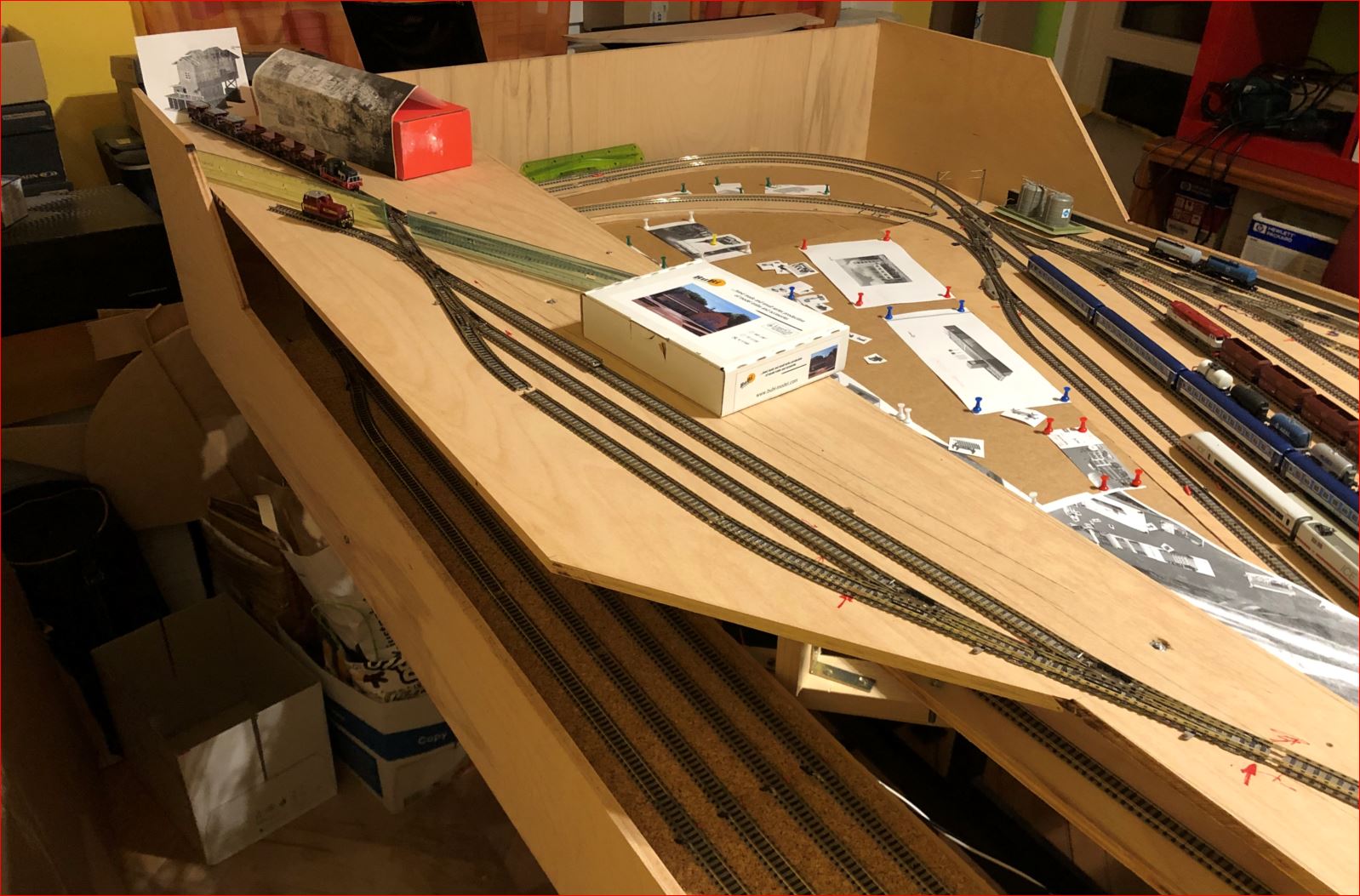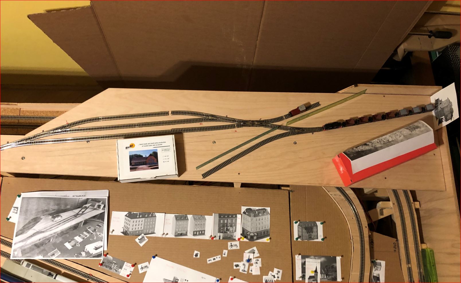 takže jsem dospěl do finále a abych uvolnil prostor pro "kamenolom", tak jsem částečně použil vzor "Vápenný Podol", akorát vlečku vytáhnul až za zadním zhlavím, kde bude brána a vjezd do areálu štěrkovny. To červené je vymezený prostor pro kamenolom, délka manipulační koleje je na 7 Talbotů a má to i šturc, kdyby se Talboty rozhodly odjet bez mašíny...