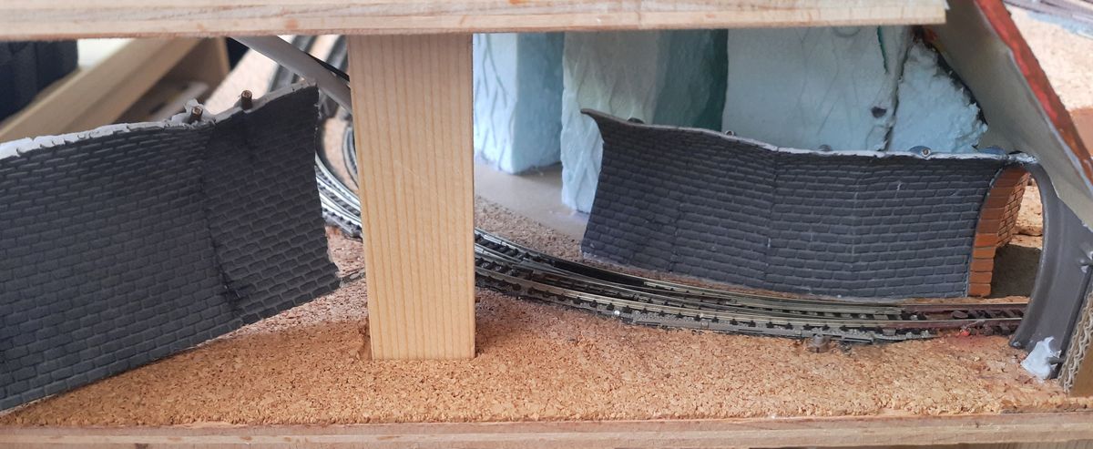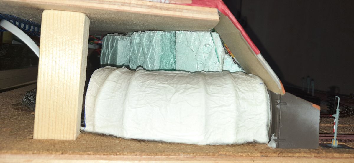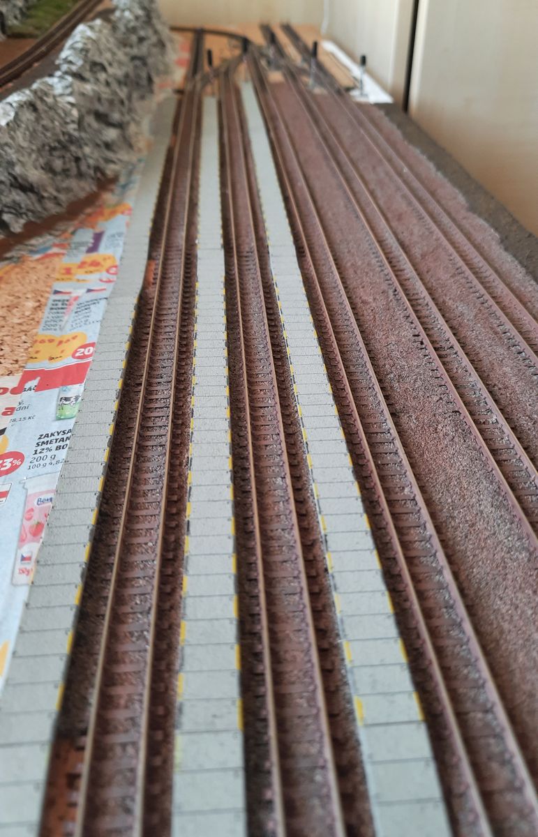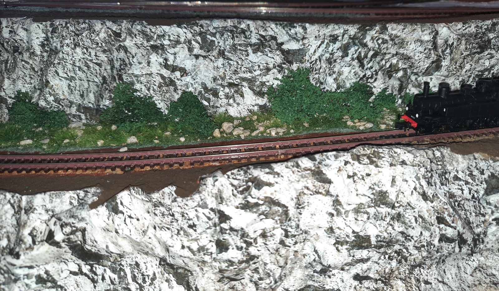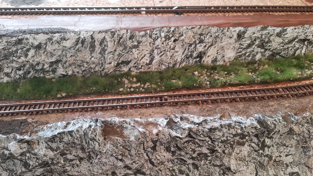 Také jsem si říkal, že když je tam skála, tak z ní nejspíš občas upadne nějaký kámen, který tam už bude ležet navždy (kdo by ho kam odnášel?). Koupil jsem tedy foliáž s kamením (má to být vápenec). Měřítkově to asi není úplně ono, ale mně se to líbí. Z druhé strany kolejí už bude jen tráva, kamen jen sem tam nějaký.