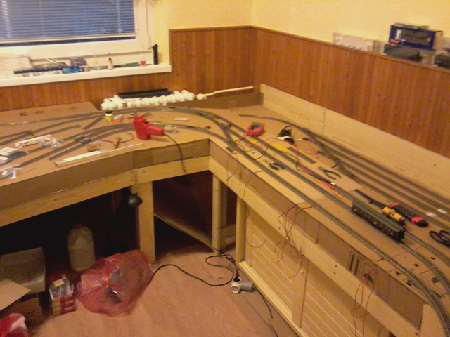 Tak přezkoušky jsou zdárně za mnou,takže vzhůru do díla. :D Koleje v budoucí továrně IG Farben umístěny včetně šturců,ještě zbývá natahat dráty napájení ke kolejím,přestavníků a rozpojovacích kolejí na čelo pultu.Moc se těším na to řezaní kolejí,protože tento díl bude vyjímatelný.Trošku z toho budou bolet záda,ale holt se to musí vydržet. :lol: Zbytek fotek je na rajčeti a doufám,že zase nedostanu do kožichu,protože tentokrát jsem se fakt snažil. :lol: