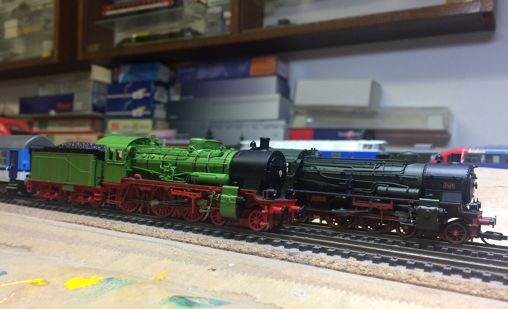 Já na staré epochy trošku ujíždím. Tehdy jsem hodně toužil po roco P8 bezva zelené, asi se mi ta svítivá zelená hodně líbila (myslím si, že tehdy měla spíše barvu tillig provedení) a mašinka mi utekla, prošvihl jsem to, zdála se mi drahá, váhal jsem co mít a nemít a již se pak neopakovala. A dnes když vidím, za co se některé roco věci prodávají, tak jsem zvolil ve slabé chvilce experimantální možnost, že ji koupím po dílech a složím, když není a nebude. Pokud něco bazarově je, ceny jsou astronomické. Takže to vyzkouším a navíc si ji můžu malinko pozměnit... Přišla mi hromada pytlíčků s díly a výsledek se zhmotnil. Vím, není to čsd, ale mám z ní radost. A můžu ji zasadit i "usměrňovací křídla", které v této epoše neměla, když je tak bezva zelená a odlišuje se 8) (popisové tabulky jsem ještě neosadil, přemýšlím, čím je přilepit, aby to drželo a nenaleptalo povrch). Provedení roco a tillig (byla kdysi ve výprodeji) se odlišují tvarově více, než jsem si původně myslel...