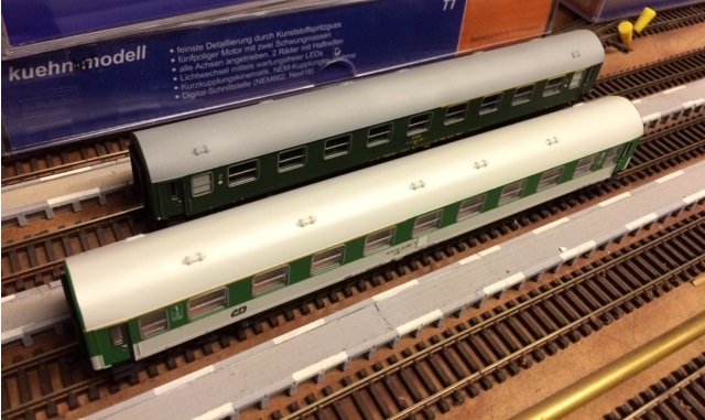 Kuehn nás zásobuje jedničkma, dvojky nejsou a na půlky naše kašle. Lze malou úpravou z toho mít 1/2. Zkoušel jsem utřít žlutý proužek - jde to párátkem (tlustším koncem) napuštěným v ředidlu a trochou trpělivosti se proužek dá postupně sundat. Stejně tak sundat 1. Pravděpodobně sundání žlutého proužku nebude dokonalé a občas to zajede i do zelené, takže lehce dostříknout. Pak již jen najít obtisky a doplnit čísla třídy a písmenka řady. Nakonec zalakovat a je to. Kuehn naštěstí okna nelepí, takže se to rozebírá a skládá snadno. Na obrázku úpravy moc vidět nejsou, v souoravě pak o vůz více...