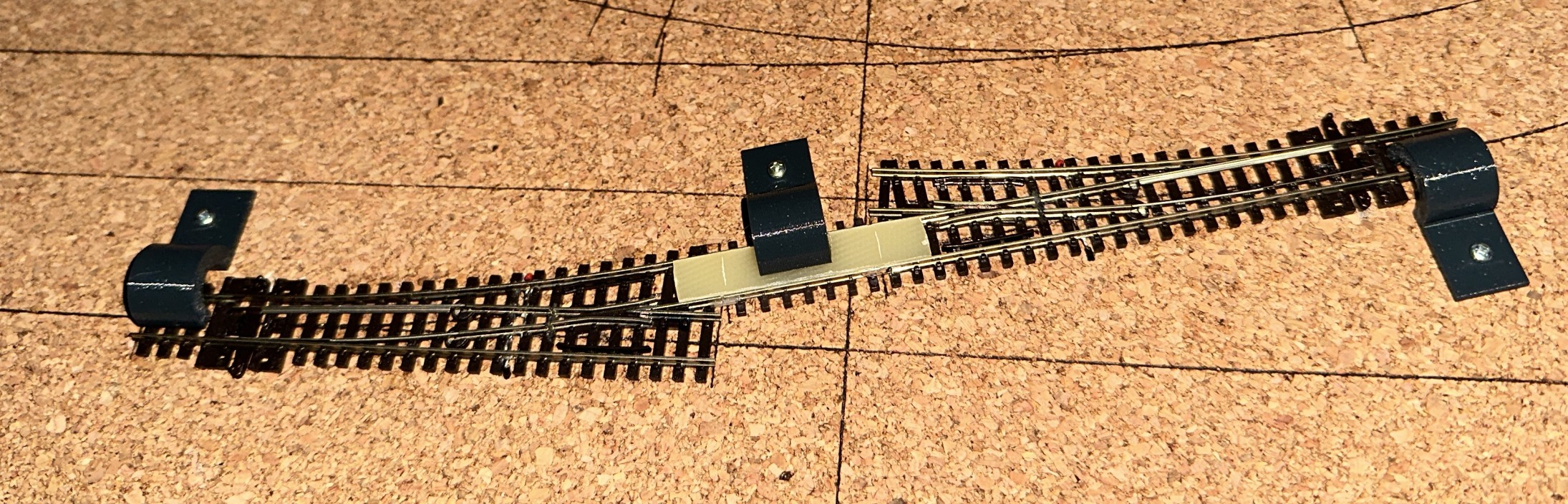 Na 3D tiskárně jsem si vytisknul takové držáčky na koleje, aby při lepení držely na svém místě a nehnuly se. Pokládka podle vylaserovaných čar je úplně v pohodě a když jsem celek přeměřoval, tak na rozměru skoro 2m jsem se "seknul" pouze o 2mm.