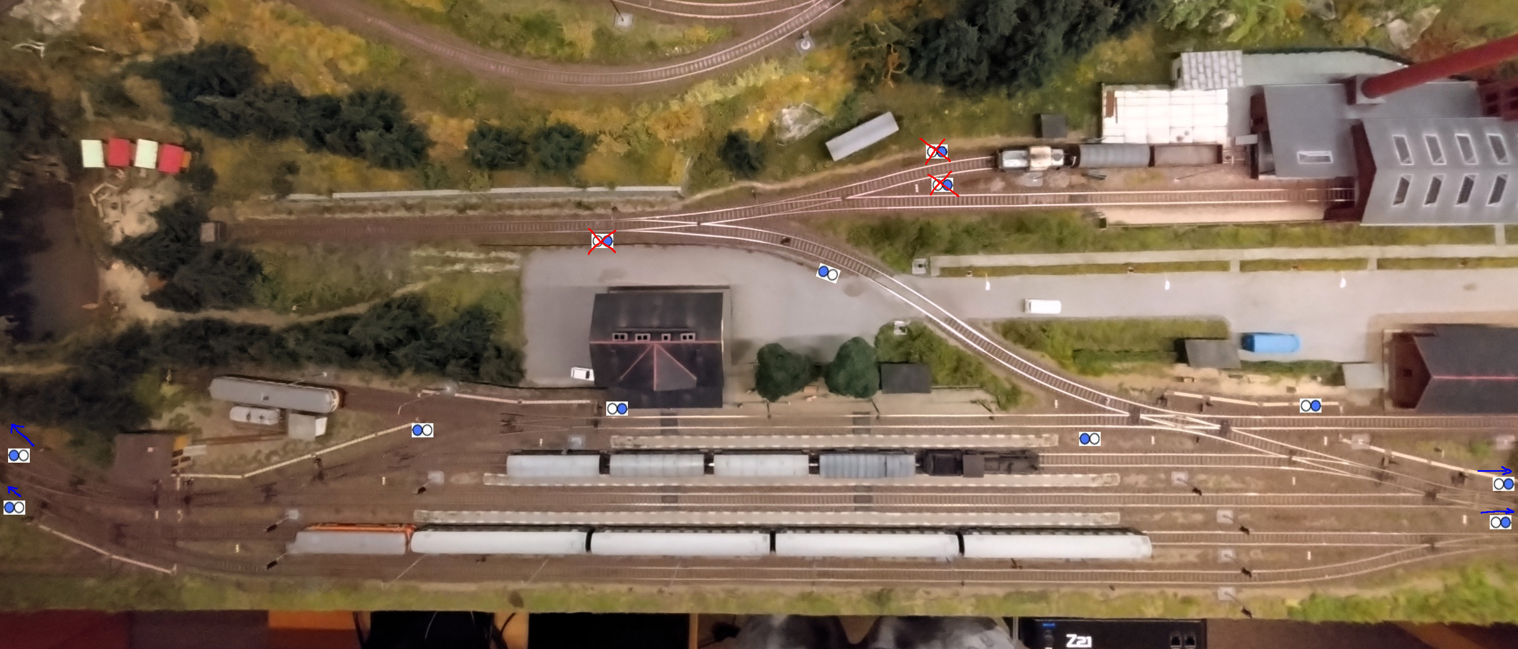 Teď, v rámci dalšího "upgrade", uvažuji o doplnění chybějících seřaďovacích návěstidel ve stanici Beránkov, kde je taky napojena tovární vlečka. Situace je trochu vidět na fotce shora, kde jsem přikreslil možné umístění návěstidel.