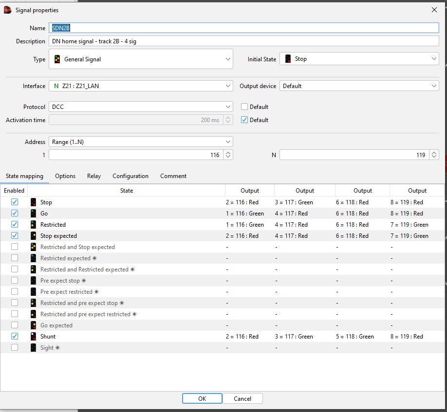 Původně totiž byly všude pouze dvouznakové (z-č), protože používaný program iTrain neuměl CZ návěstní soustavu a bylo nutno používat systémový tzv. "General signal", který měl pouze dva stavy. A tím pádem kolejiště v tomto ohledu bylo spíše hračkové. To se s příchodem novější verze změnilo. Sice vývojáři stále nepočítají s CZ / SK uživateli (předpokládám, že na jejich spočtení by stačily prsty jedné ruky), nicméně funkce "General signal" byla rozšířena na čtyři znaky (standardně z-ž-ž-č), které se však dají přemapovat na čtyřznakové návěstidlo, jehož funkce se již "podobá" naší návěstní soustavě. Já jsem dospěl k následující konfiguraci aspektů.