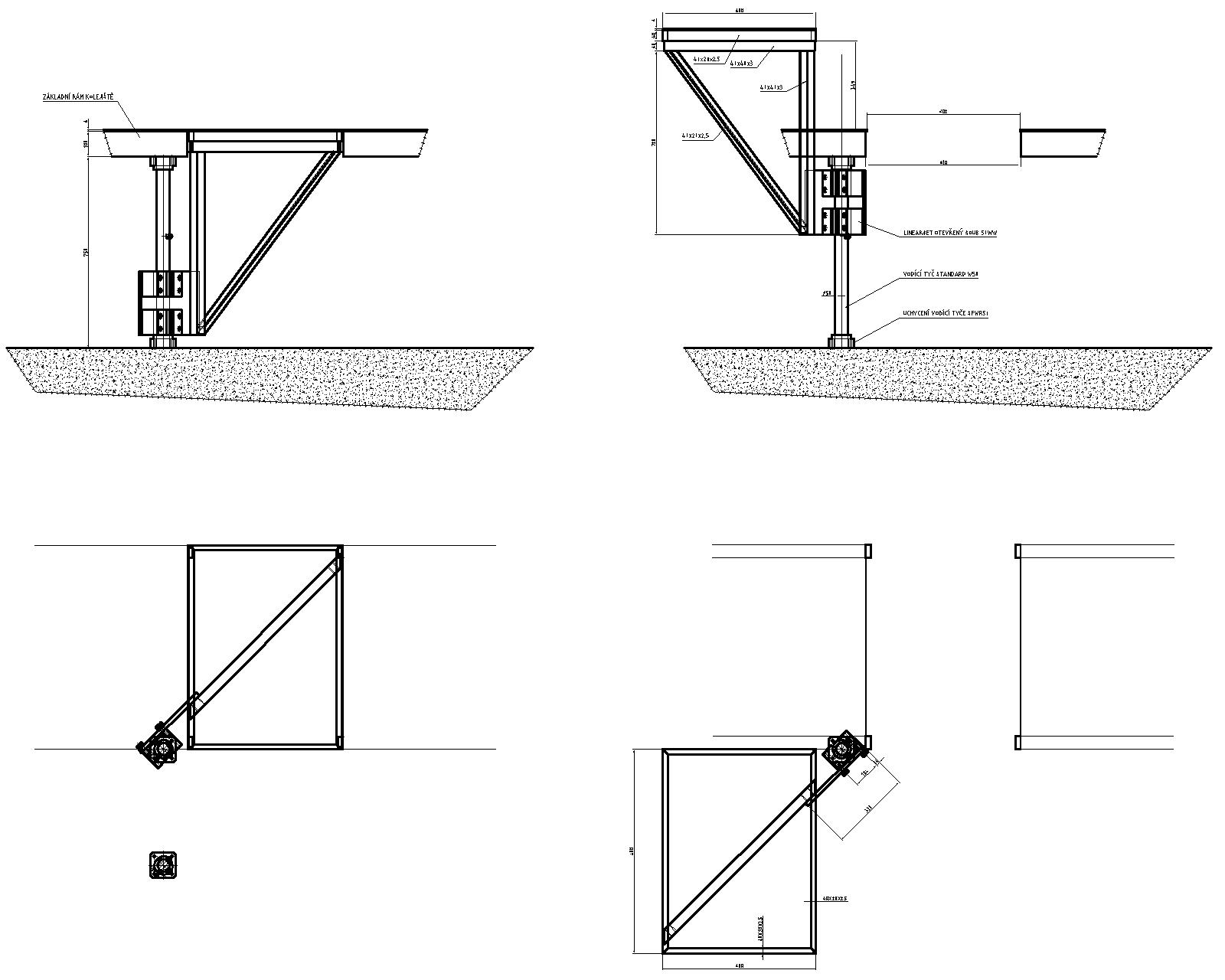V provozní poloze bude rám ležet na dorazu s nějakým kolíkem pro fixaci polohy, v případě potřeby průchodu se rám na tyči vysune nahoru a otočí. Vysunutá poloha bude jištěna taky dorazem umožňující výškovou a stranovou fixaci. Uvažuji i o nějakém protizávaží pro jednodušší zvedání.