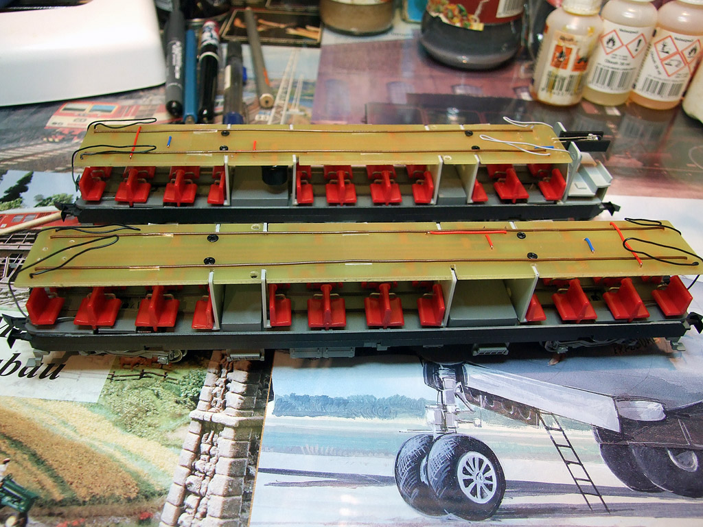 Hotové plošné spoje jsem přišrouboval k přepážkám a připájel jsem k nim drátky od podvozků.