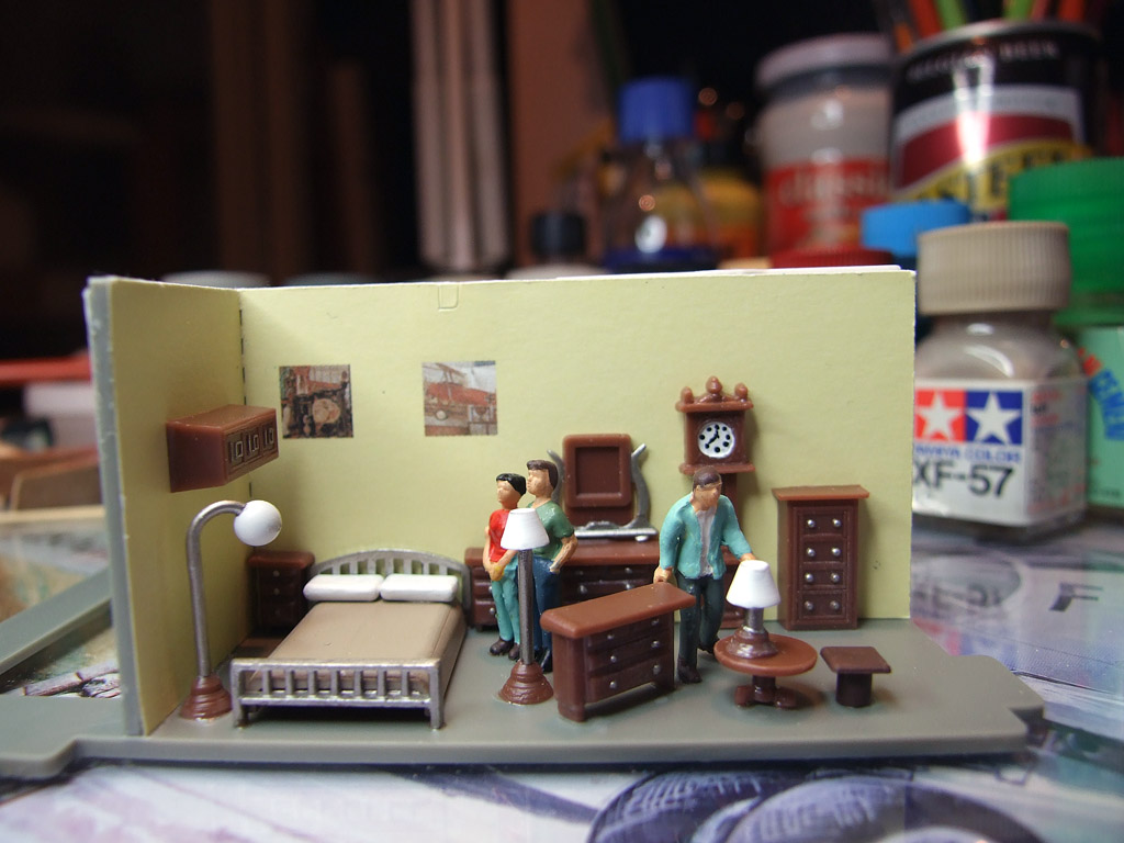 - V prodejně nábytku bylo pro změnu všechno z hnědého plastu, takže jsem natřel postel s polštáři, velkou lampu, lampičku, hodiny, úchytky zásuvek a zrcadlo, do kterého jsem později dal také samolepící stříbrnou pásku. Zde jsem také přidal figurky z vlastních zásob, aby obchod vypadal realističtěji.