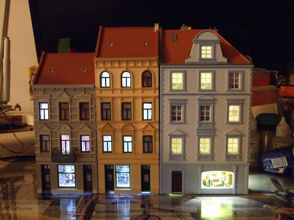 Na kolejišti jsem tentokrát nepracoval, ale pustil jsem se do stavby domů, abych měl nějakou zásobu, až dojde na stavbu města na kolejišti. Slepil jsem celkem tři domy, dva od Auhagenu a jeden od Fallera. Nafotil jsem pouze stavbu rohového domu od Fallera H0 130906, která mi přišla nejzajímavější. Dům má v přízemí dva obchody, kterými jsem začal, jsou to kadeřnictví a prodejna nábytku. Nejprve jsem slepil stěny obchodů a na ně jsem přilepil dekoraci. Vybavení v kadeřnictví bylo celé v bílém plastu a obchod s nábytkem byl celý v hnědém plastu, takže jsem natřel různé detaily, podrobný popis u fotek. Do obou obchodů jsem ještě přidal další figurky z vlastních zásob, aby obchody vypadaly realističtěji. Pokračoval jsem zadními stěnami domu, které jsou z cihel bez omítky. Tyto stěny jsem natřel bílou barvou Gunze Mr. Base White 1000, kterou jsem následně setřel ředidlem Gunze Mr. Color Thinner 110 tak, aby bílá barva zůstala jen ve spárách mezi cihlami. Do takto připravených stěn jsem zalepil okna a dveře lepidlem Tamiya Extra Thin Cement a okna jsem zasklil průhlednou folií ze stavebnice. Poté jsem stěny slepil k sobě. Ve stavebnici je papírová výplň s okny, která je z tenkého papíru a při osvětlení prosvítá. Takže jsem si udělal ještě jednu stejnou výplň domu, která je z tvrdého papíru. Do ní jsem si vystřihl jen některá okna, která budou v noci svítit. Výplň z tvrdého papíru jsem zasunul do výplně ze stavebnice a mobilem jsem pro kontrolu prosvítil okna, abych zjistil, jestli vše sedí. Poté jsem obě výplně slepil k sobě. Dále jsem pokračoval s předními stěnami do ulice. Každá stěna se skládá z dílu s výkladní skříní, další díl je první a druhé patro a poslední díl je třetí patro. Na jedné stěně je ještě navíc výklenek přes všechna tři patra. Nejdříve jsem na jednotlivé stěny nalepil fasádní prvky okolo oken, do kterých jsem přilepil samotná okna. Pak jsem všechny tři díly stěn slepil dohromady, včetně modré dělící lišty mezi druhým a třetím patrem. Když jsem měl stěny takto hotové, okna jsem ještě zasklil folií ze stavebnice. Oboje dveře do obchodů a dveře do domu byly modré jako celá spodní část domu, což se mi nelíbilo, takže jsem všechny dveře natřel světle hnědou barvou a po zaschnutí barvy jsem je ještě napatinoval Umbrou pálenou. Výlohy v obchodech měly být původně zasklené folií ze stavebnice, ale ta mi přišla příliš tenká na tak velkou plochu, takže jsem obětoval průhledný plastový obal na CD, ze kterého jsem vyřízl tvar výlohy a zalepil na své místo. Potom jsem se pustil do osvětlení domu, nejdříve jsem nad obchody vytvořil strop z tvrdého papíru, do kterého jsem zalepil diody a připájel odpory s drátky vyvedenými ven z domu. Oranžový drátek je na plus pólu diody a šedivý drátek je na minus pólu spolu s odporem. Pro osvětlení horní části domu jsem použil tři diody, které jsem umístil pod střechu do horní části papírové výplně. Diody jsem opět opatřil odpory a drátky, které jsem vyvedl po stěně papírové výplně dolů a ven z domu. Po kontrole funkčnosti osvětlení jsem výplň domu přilepil ke stropu obchodů. K takto připravené konstrukci domu jsem přilepil přední stěny s výlohami, které jsou do ulice. Dům má pěkný vikýř, takže jsem ho chtěl také osvětlit. Do střechy v místě vikýře jsem vyvrtal díru 3 mm, do které jsem zalepil diodu, ke které jsem opět připájel drátky a odpor. Než jsem přilepil střechu k domu, drátky jsem připájel k rozvodu horního osvětlení pro dům. Po přilepení střechy jsem si slepil stěny vikýře a podle nich jsem si udělal z tvrdého papíru výplň, aby mi světlo diody neprosvítalo. Ve vikýři měl být původně modrý rám okna, ale protože má celý dům bílá okna, nastříkal jsem tento rám také na bílo barvou Gunze Mr. Base White 1000. Rám okna jsem následně vlepil do vikýře, zasklil ho folií ze stavebnice a k oknu jsem přilepil imitaci záclony. Poté jsem ke střeše přilepil výplň vikýře z tvrdého papíru, okolo které jsem postavil vikýř. Pak už jsem dolepil jen malý vikýř z vnitrobloku, střešní okna, štít domu a okapy. Na celou stavbu a bližší popisky se můžete podívat na fotkách.