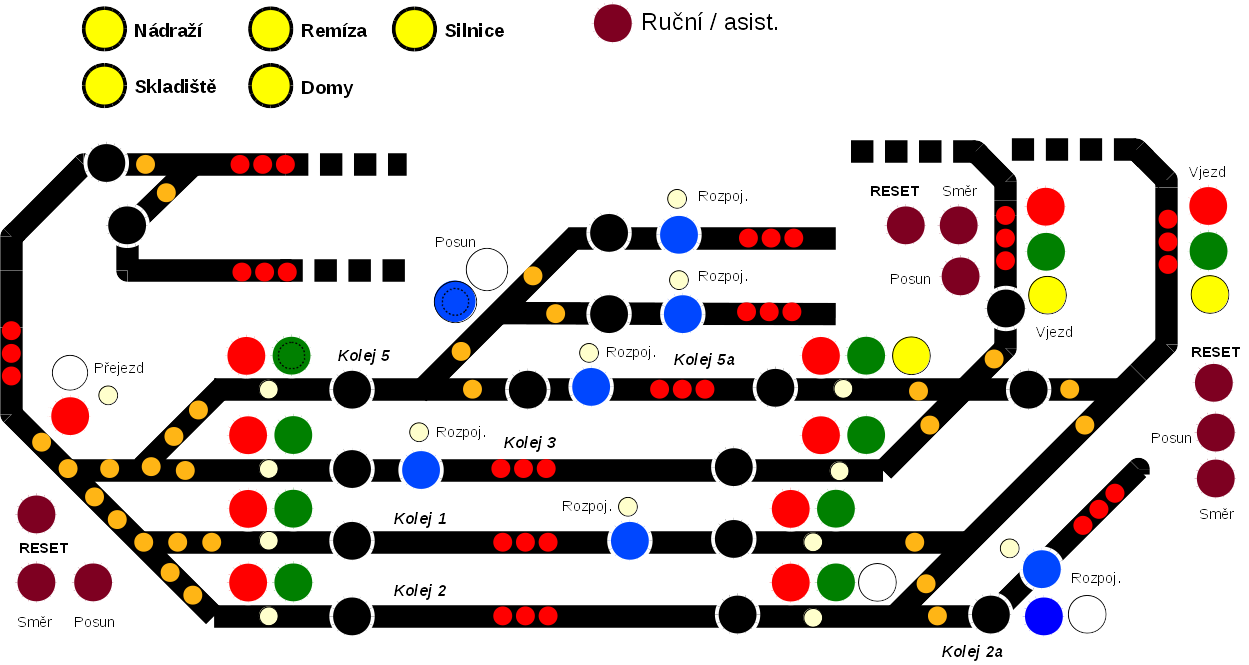 Dlouho jsem se odhodlaval ... no ;) pseudonavrh se odhodlam ukazat. Velky kolecka jsou spinace (kolo je cca 11mm, tzn 7mm dira + limec), mala kolecka jsou 5mm LEDky. U kazdeho zhlavi je RESET tlacitko, ktere ma za ukol shodit vsechna navestidla na stuj (posun zakazan). "Posun" ma byt prepinac menici vyznam volno (zelena) -> posun povolen opet pro navestidla na danem zhlavi.