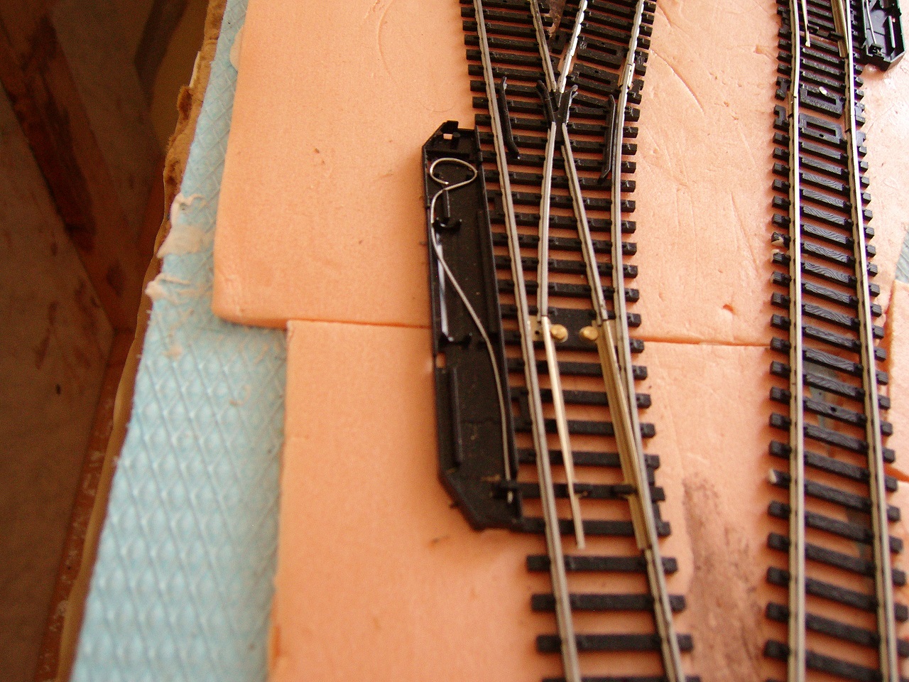 Použil som výhybky Mehano, sú na to ideálne. Ako pružina je tam viazací drôt, ktorý je dostatočne pružný ale zároveň mäkký a nekladie odpor. Fotka je iba pre H0 ilustračná, robím 0e.