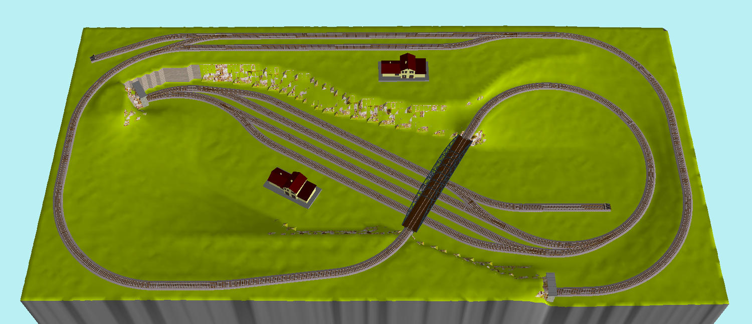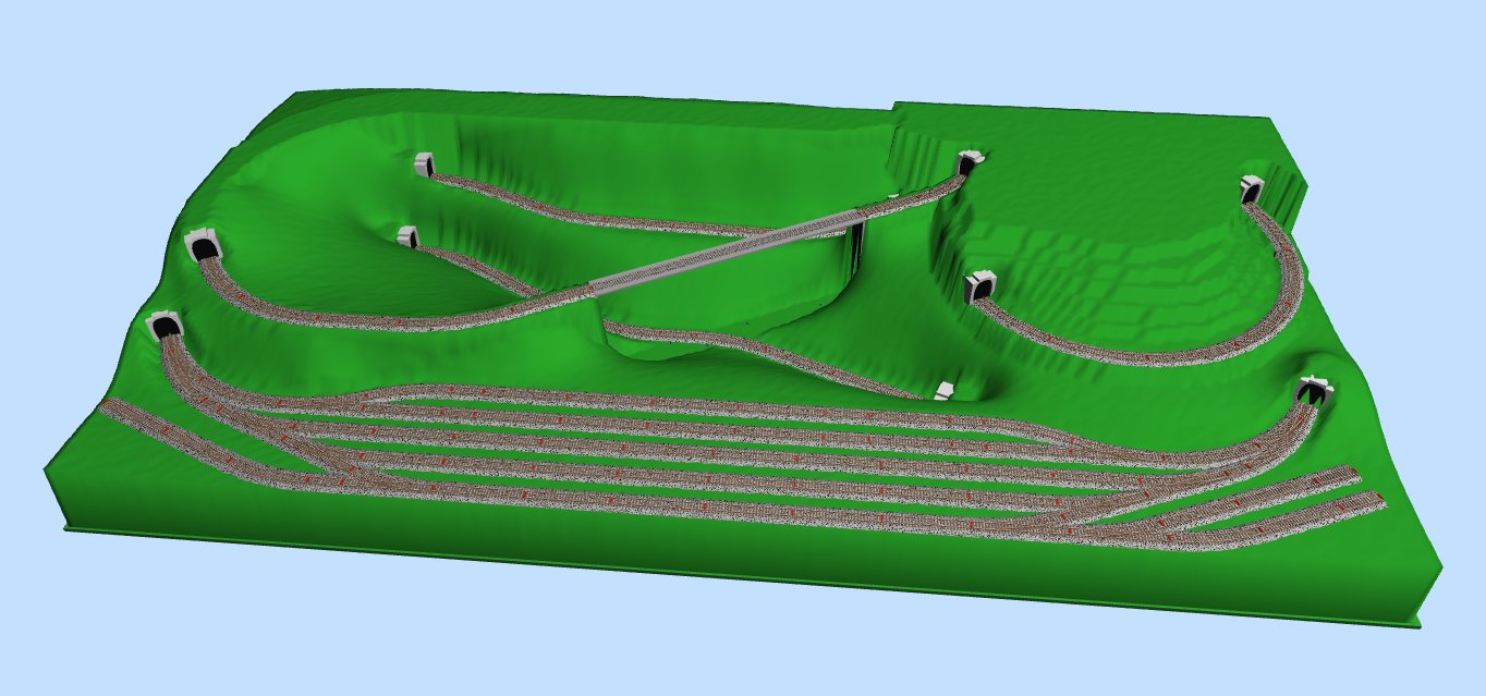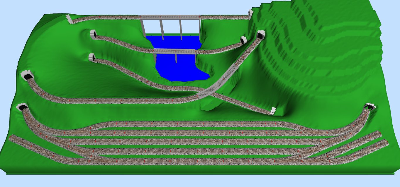 Zkusil jsem si ještě udělat jedno cvičení. V zásadě můj původní návrh, jen horní přemostění je výrazně posunuto, třeba by tam mohlo výt něco jako „Ivančický viadukt“ a naopak celu zadní část jsem schoval do tunelu s tím, že je tam dvoukolejné skryté nádraží. Zase mám ale problém s vodou v nejnižším patře. Už to alespoň nevypadá, že na vrchním patře jen bezdůvodně krouží vlak.