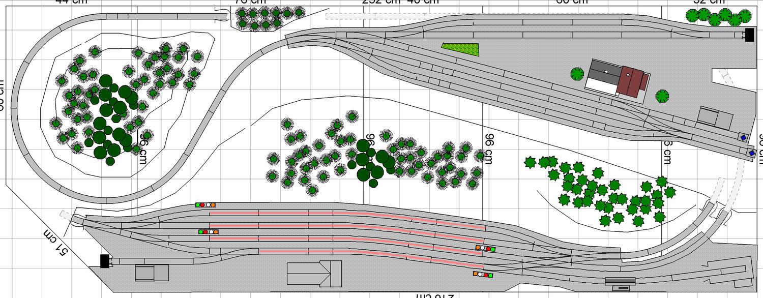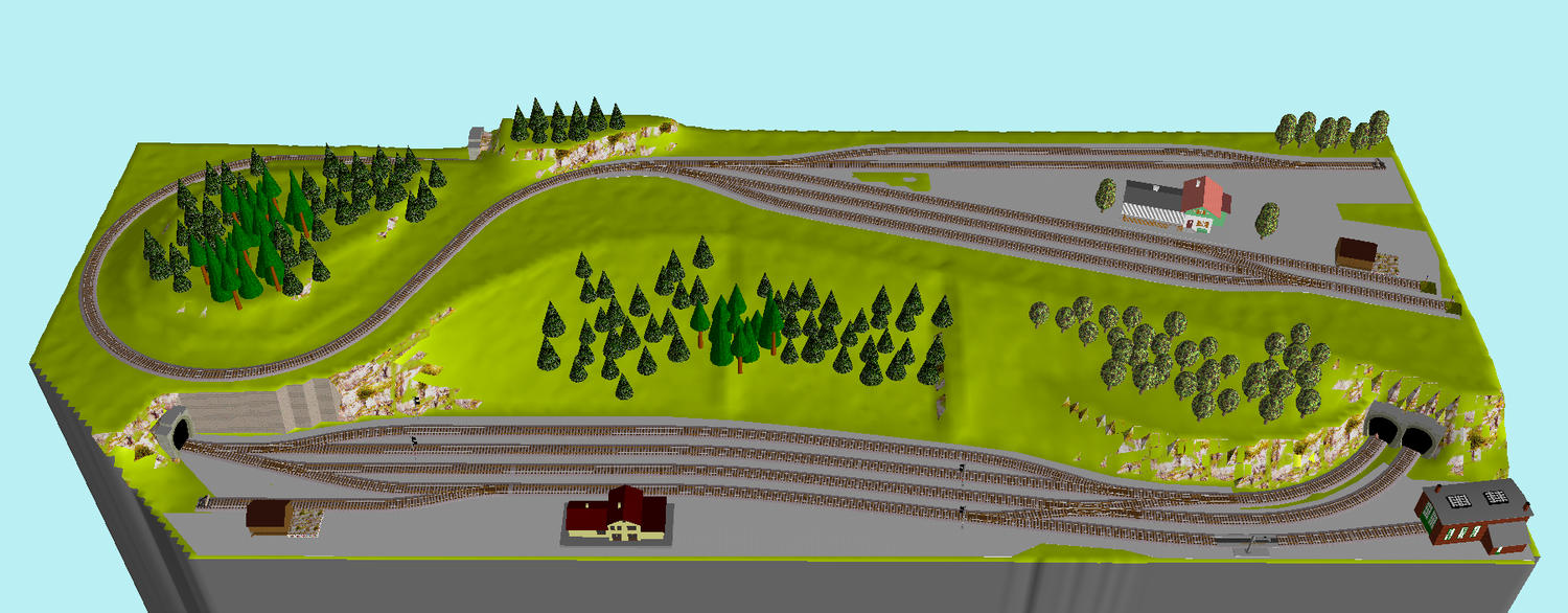 lajbit: To nádraží do mírného oblouku je skvělý nápad. Ten vjezd z hlavní trati přes výhybku odbočkou se mi také moc nelíbil. Popravdě ale dám přednost výhybně, před o trochu delšími kolejemi v nádraží a tím i možnosti větší variability provozu. Navíc jsem chtěl alespoň o trochu dostat od sebe dále portály tunelů jednotlivých tratí, proto jsem nepoužil odstavnou kolej vpravo. Odstavná kolej vlevo, která je tam navíc, mi zase umožní přepřáhnout lokomotivu na vedlejší trati, aniž bych zasáhl do provozu na jednokolejce. Výhybnu jsem nakonec nechal ve stoupání tak, jak mi doporučil