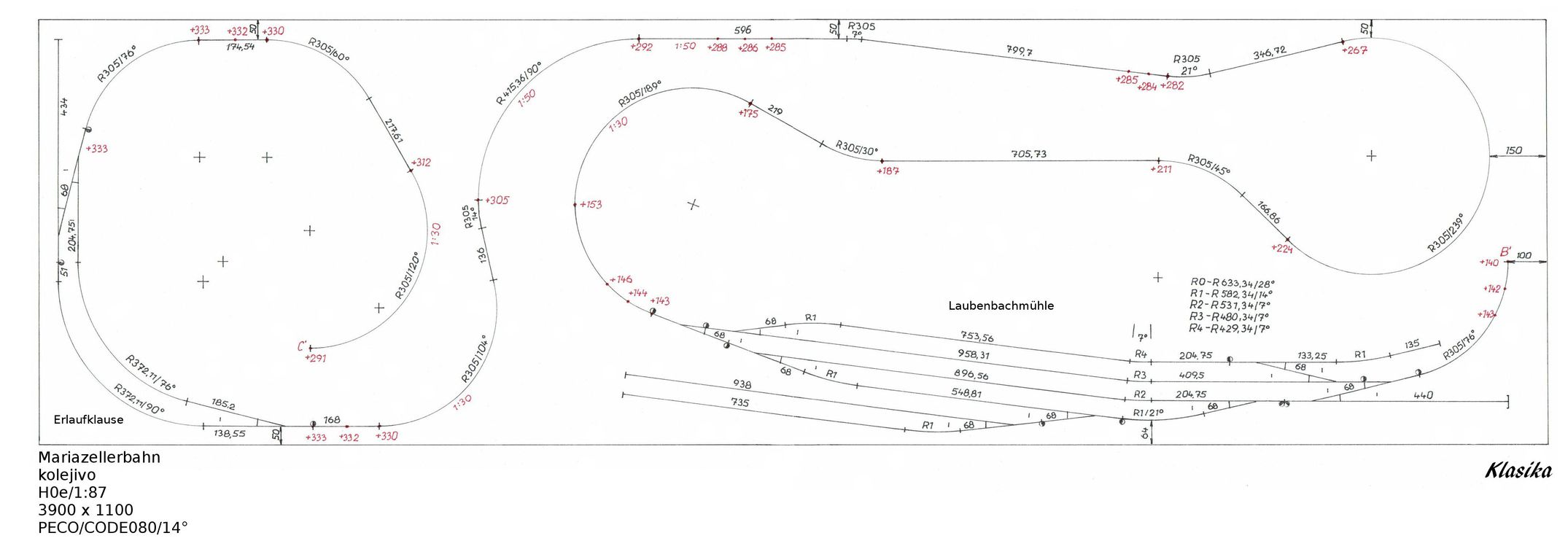 Mockrát děkuji Milane, Nečekal jsem že tak rychle něco vznikne, teď se to budu pokoušet přenést do Scarmu ze kterého pak budu vycházet při stavbě (+ nějaké práce v Catia - konstrukční program na 3D tvorbu modelů a výkresů - konstrukce rámu a přechodových čel). Zatím jsem překreslil a decentně upravil skryté nádraží. Trochu se obávám zda spirály budu mít přesně umístěné, ale napojení na stanici Laubenbachmühle vcelku vyšlo.