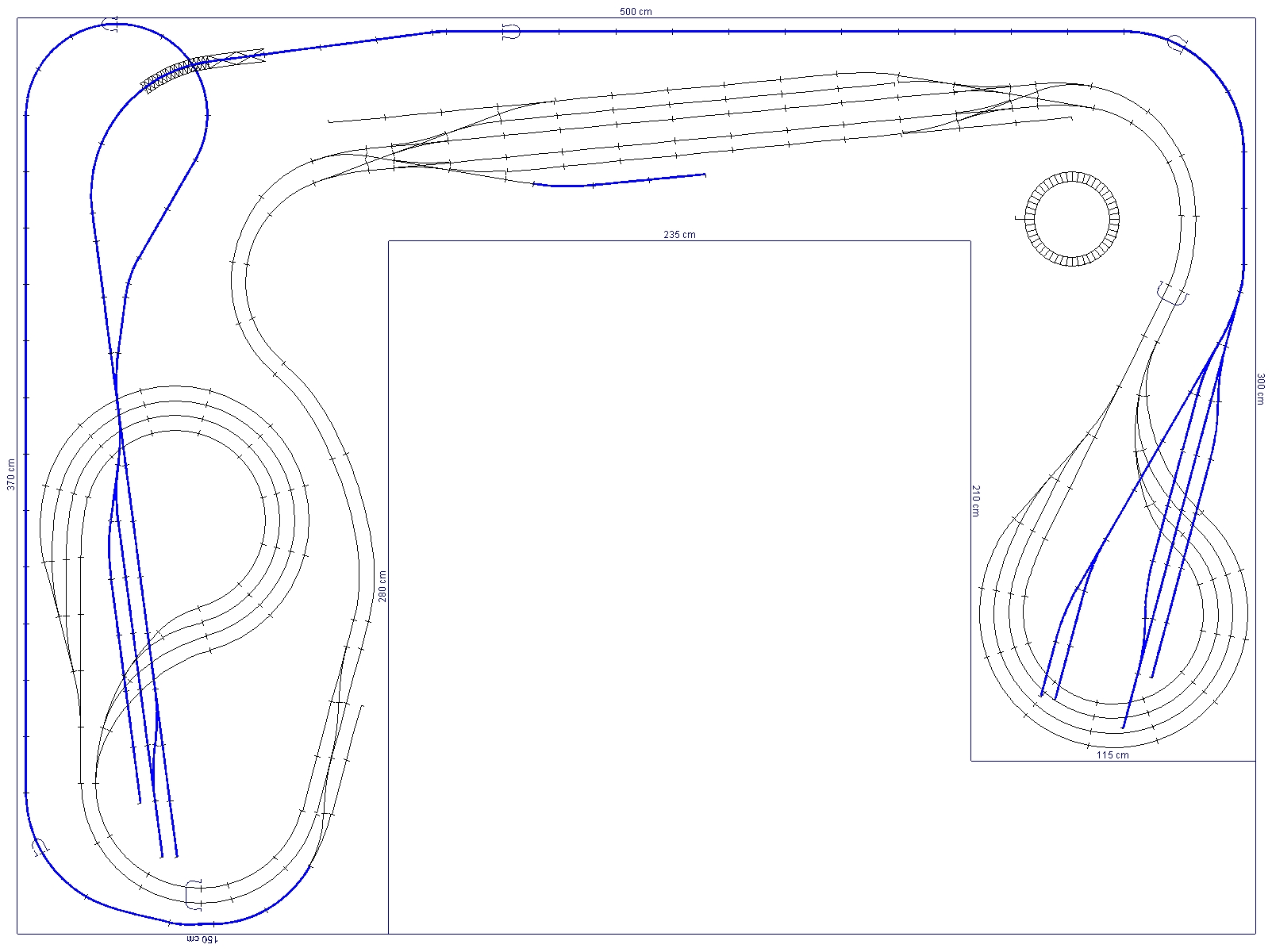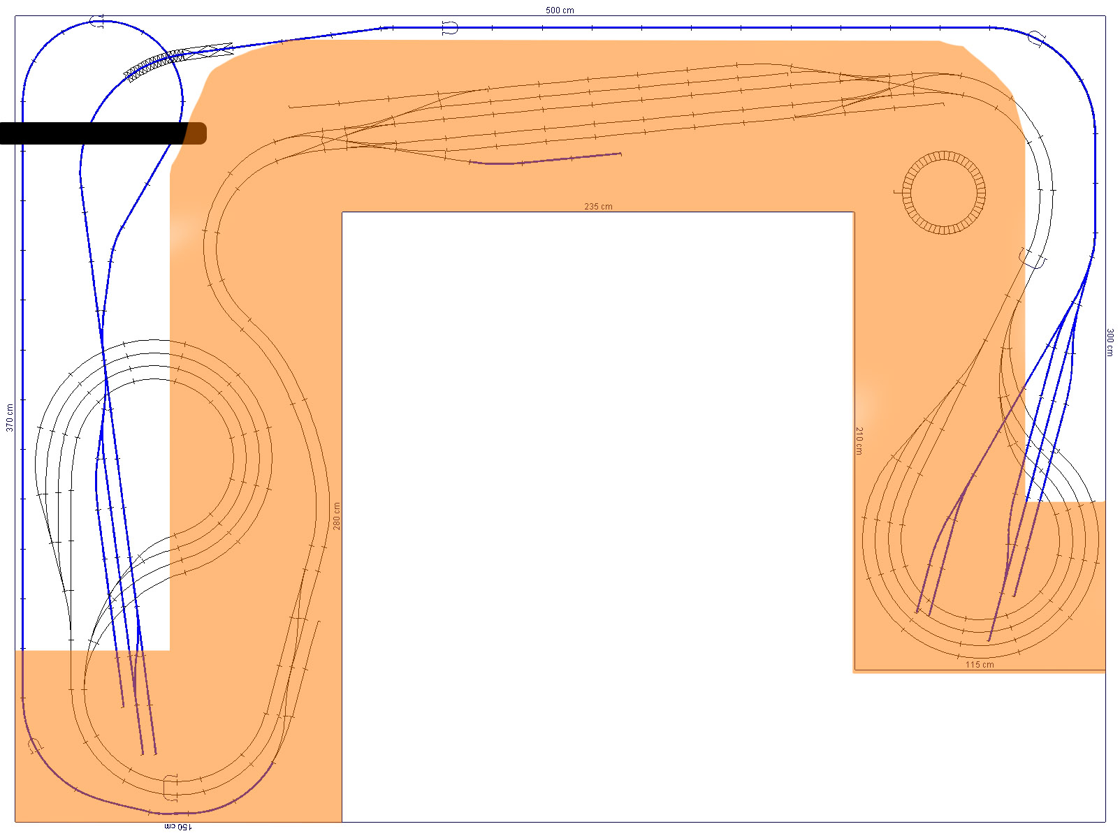 Bývalé kolejiště (L 3,7x 2,8 m) jsem měl na rovné podlaze a na kolečkách od popelnic (jsou s brzdou). Základ rámu byl kvůli pevnosti ocelový a v jednom člověku to byl docela problém uřídit, respektive hýbat s tím šlo pěkně ale uhlídat, abych něco nezníčil už bylo horší. Podle mě bude ideální nechat si nalevo ten navrhovaný pruh a kolejiště nechat napevno.