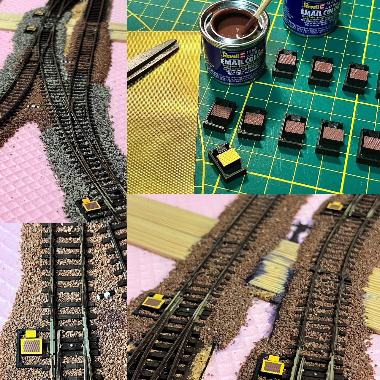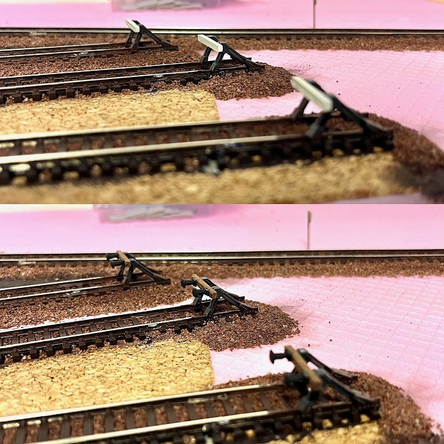 Teď zpět ke kolejím, myslím, že kdybych stříkal koleje, tak bych pak tu barvu měl asi opravdu všude, protože u toho bych odtah díky rozloze mít nemohl, proto zpětně rozhodnutí patinovat prachem hodnotím pozitivně. Asi to ještě bude někde chtít přidat a doladit, ale v základu jsem s tím spokojen. Jelikož štěrkování už chvílemi vypadalo, že nemá konce, tak jsem si zkusil i ten první kus nějaké té krajinky, abych se alespoň trochu odreagoval a dostal zase pozitivní náladu. Z polí zatím sešlo, jelikož to je přeci jen celkem velký kus a nechci tam naflákat jen nějaké foliáže, ale chtěl bych si s tím trochu víc pohrát, takže jsem zvolil místo na berounském zhlaví v Rudné. Zde mám dnes již ve skutečnosti neexistující odstavnou kolej, tak jsem k ní udělal okolí. Dalším zpestřením byla záměna fošen u Tilligáckých šturců. Jejich standardní bílé prkno se mi moc nelíbilo a opět díky rekonstrukci Kladenského nádraží jsem denně chodil kolem naskládaných obdobných zarážedel a tak jsem se inspiroval. Držáky fošny jsem zachoval, ale fošnu nahradil vlastní reálnou dřevěnou s osazenými nárazníky od SDV a trochu obarvil - no hned to vypadá o mnoho lépe.