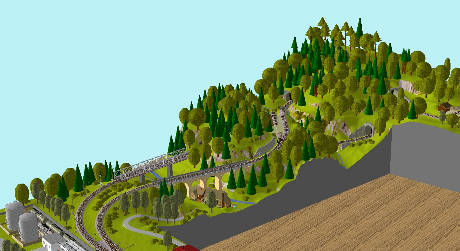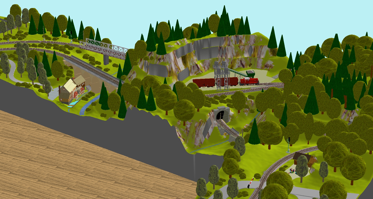 Vrstvy mají taky výhodu, že si nechám zobrazené jen koleje, posunu co potřebuju, aby to mělo tvar, jaký chci (stoupání atd) a pak, až je to vyhovující, k tomu si zpátky porovnám stromy. Jejich pozice (výška) je daná terénem, takže se samy umístí podle toho, jak jsi změnil terén třeba při změně nivelety kolejí. Dtto skryťák - můžu ho mít ve stejném plánu, jen není normálně vidět.