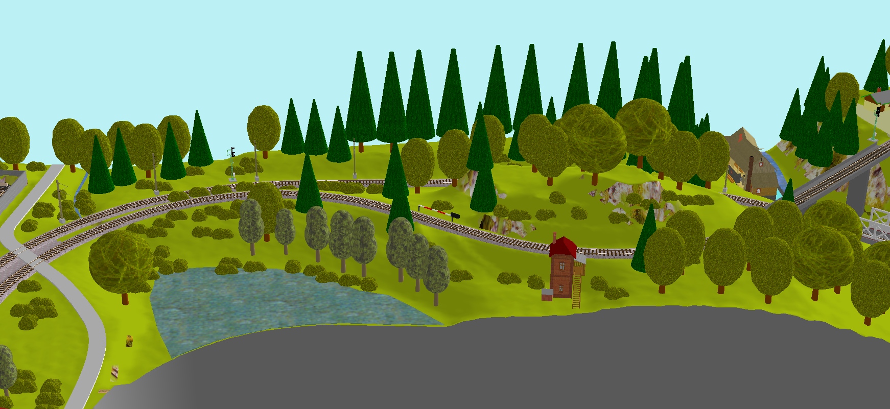 - Dál tvaruju terén vkládáním křivek či ploch se zadanou výškou. S tím souvisí výšky kolejí, které jsou v základu "v nule" a je potřeba jim nastavit výšky (jde to i systémem od - do a sklon se spočítá a zobrazí sám).