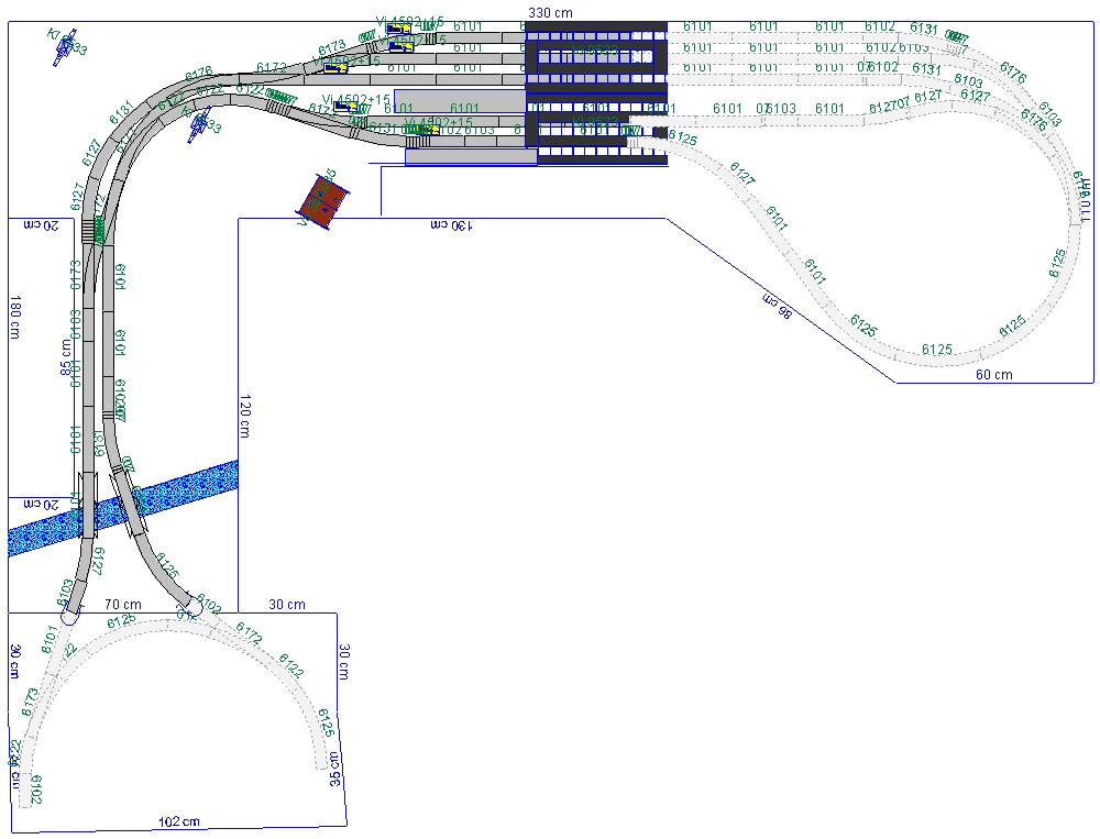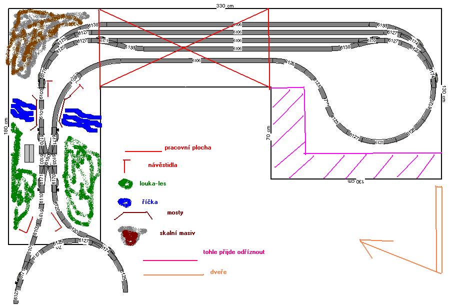 Má představa je taková,že vjezd i odjezd do SN budou řídit 4 návěstidla,která budou svázána se dvěma výhybkami v tom oblouku staré části.Zároveň bych rád,aby se ve SN řadily vlaky samostatně na volnou kolej a postupně ve SN řadily zase na odjez,takže i s toho důvodu jsem volil řekněme jednoduché řešení.Viditelná část bude až ke zdi,za ní bude pracovní plocha a za ní řekněme odkládací plocha,které není nikdy dost.Krajinu ve viditelné části mám v úmyslu pojmout tak,že v místě napojení bude pokračoval travní a lesní porost,dále bude následovat říčka přes kterou povedou 2 mosty do tunelu a nad tím se směrem do rohu bude zvedat skalní masiv.Více je snad patrné z přiloženého obrázku.Ještě jednou díky,Míra