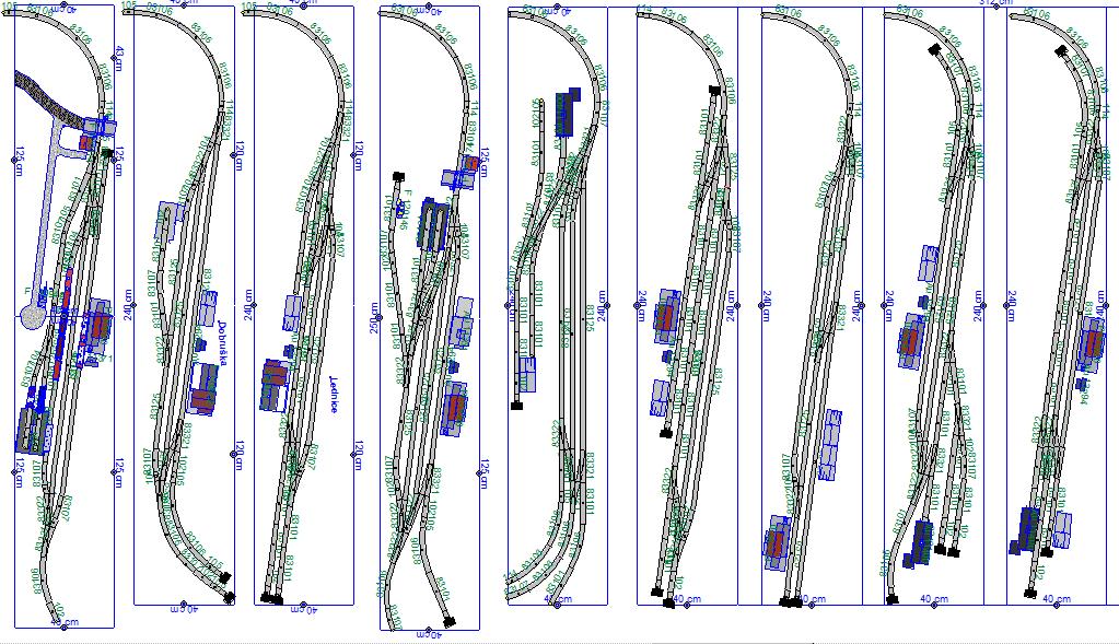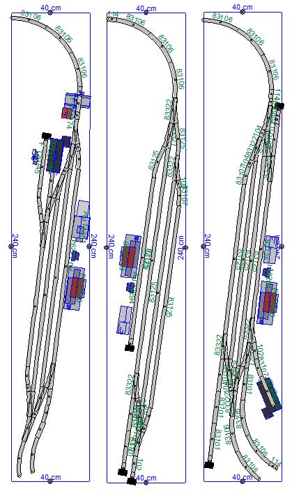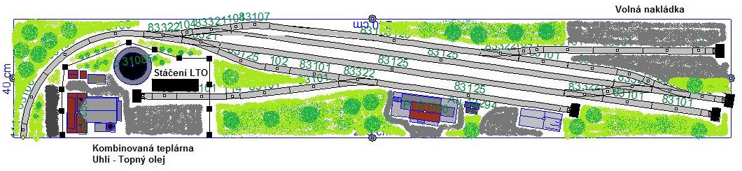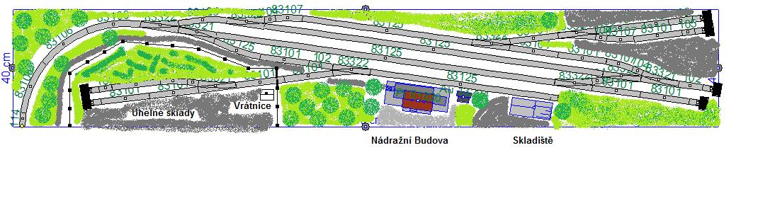 Souhrnem: To levé zhlaví, kde z levé výhybky mám za ní pravý oblouk do další levé výhybky - Je to nepěkné, a nesedí mi to. I za cenu řezání kolejí bych to posunul tak, abych se vyhnul hraně stolu a měl normálně rozvětvené zhlaví. Být to podle mého gusta, asi bych zrušil volnou skládku tam, kde teď je, tam prdnul výpravní budovu, kolej u skladiště prodloužil na úroveň ostatních šturců, a dal do toho šturcu volnou skládku. U skladiště levá výhybka, napojující se do zhlaví. buď do angličana, nebo do proti ní ležící další levé výhybky.