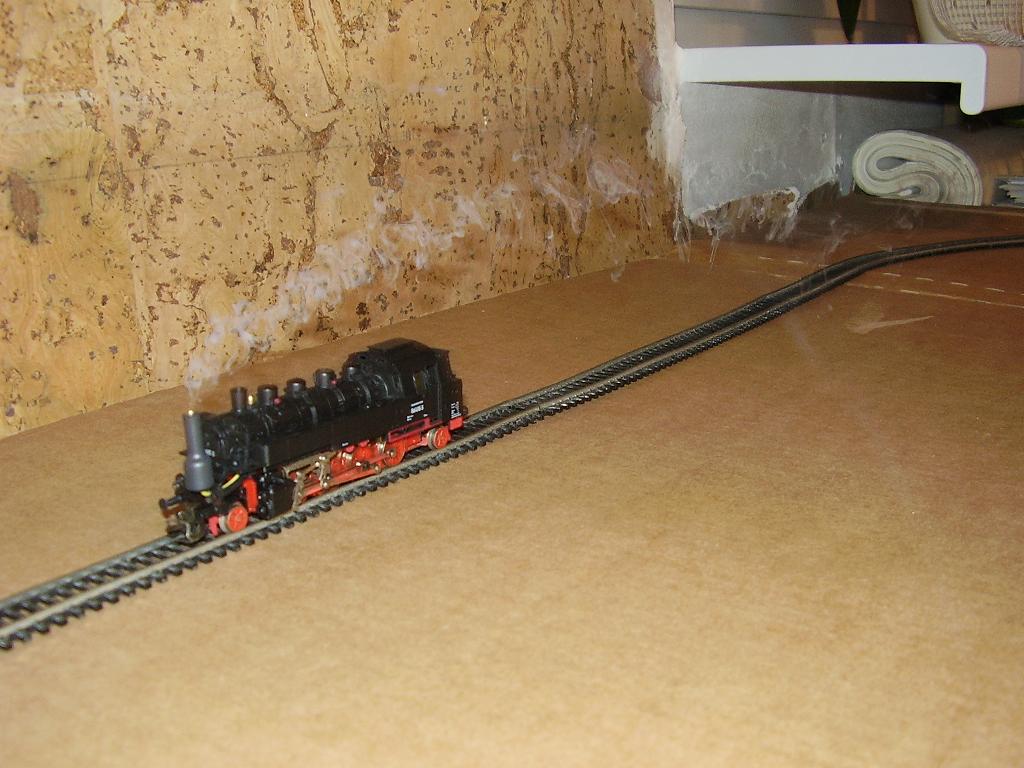 Ještě k tomu kouřovému generátoru... U obyčejného analogu je nevýhoda, že k dostatečnému žhavení potřebuje 10V, což znamená jízdu skoro na "plný kotel". Taková rychlost je ale extrémní. Normální je jízda tak kolem 50-60% regulátoru a pomalejší (zvláště na menším panelu, kde je to samý oblouk a žádná delší rovinka pro rychlejší jízdu). Při této normální jízdě ale nemá žhavení ke generování kouře dostatečné napětí a bylo by tak potřeba u obyčejného analogu přidávat před motorky lokomotiv extra předřadné odpory, které by jízdu zpomalily a lokomotiva tak kouřila i při normálních rychlostech.