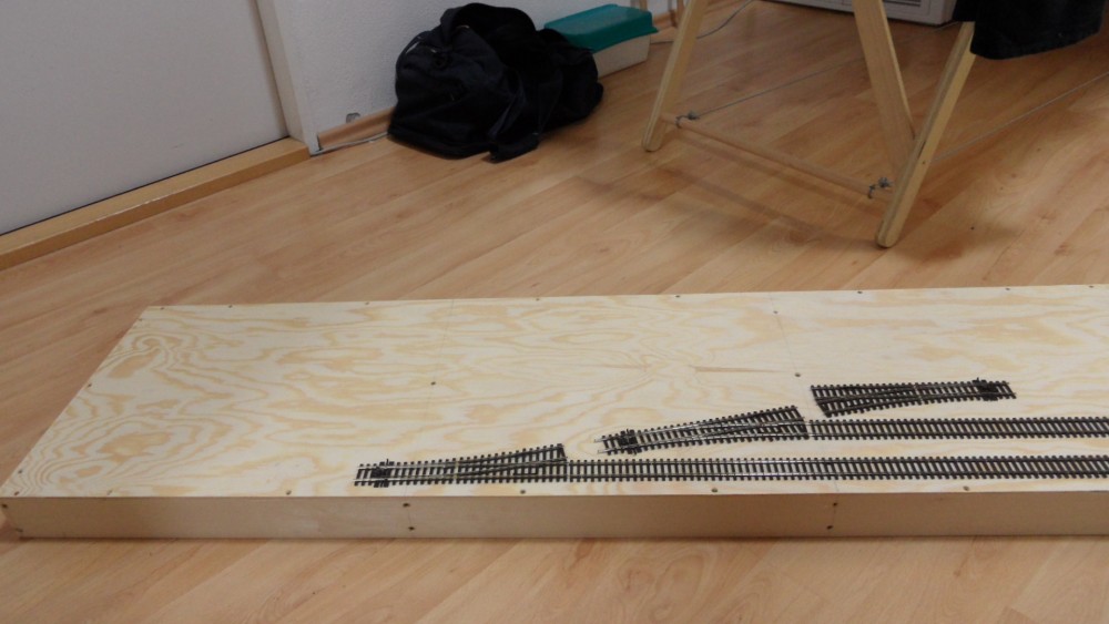 Tak už mám všechny veksle, krom těch dvou krátkých k remíze. Ale hlavně se narodily první dva segmenty :-) 109x36 a 129x36 cm. Obvod a žebra jsou latě 60x13, potah 4mm překližka. Všechny spoje jsou prolepeny a sešroubovány. Tuhost naprosto dostačující, ale i tak na to půjde ještě buď 30 nebo 50mm EPS. Hlavně potřebuji zvednout takto celou pláň stanice, protože třetí segment je s mostkem. Překližka vlastně tvoří jen "spojovací"vrstvu, hlavně pro uchycení všeho možného co bude zespodu. Zvolil jsem nakonec kolmé rozhraní. Před dalším dodělám mechanické propojení segmentů na dva čepy a šrouby a v žebrech otvory na káblíky.