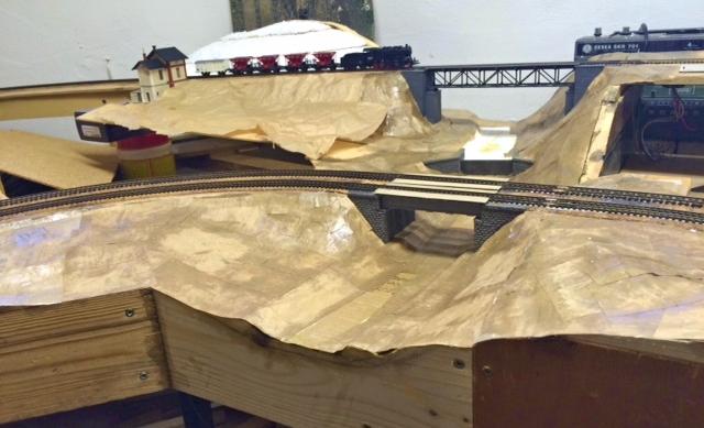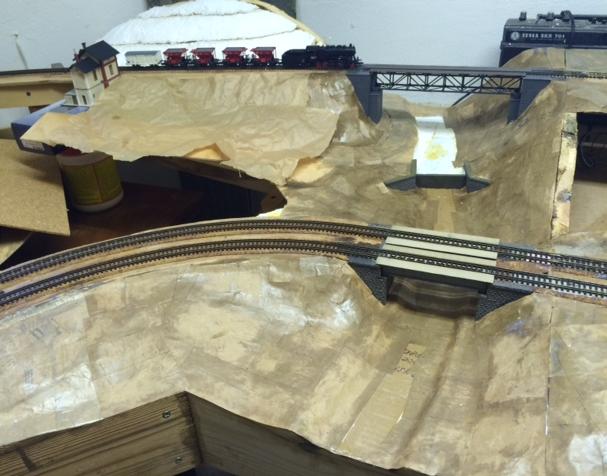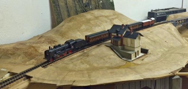 Podařilo se mi konečně částečně zprovoznit poslední stanici, když jsem namontoval přestavníky s táhly, zapojil srdcovky jak je výše uvedeno a konečně tak přilepil první kolej, po které lze stanici projet - musel jsem také směrově upravit část zhlaví a kousek koleje, aby to nebylo jak kozí dráha, aby to tedy bylo celkem rovné. Prostě rovné podloží překvapivě také rovné nejsou, takže klasická hřebíčková metoda posouvání a znovu přilepování.