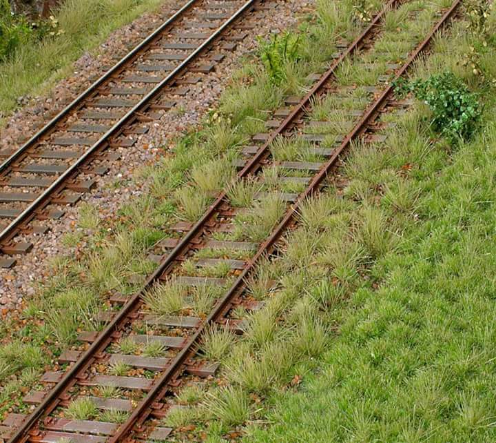 fotky jsou pěkný, jen tak dál. :) Když jsem zkoušel ve velikosti TT vyrobit trsy trávy v kolejišti já, zkusil jsem to takhle: Obyčejnou foliáž jsem natrhal na co nejmenší kousky a ty jsem nalepil na povrch štěrku "po prvním podbití". Pak jsem dosypal ještě jednu vrstvu tak, aby štěrk dosahoval k horní hraně pražců, čímž částečně zakryl i předtím nalepené drny a tím vytvořil iluzi, že tráva prorůstá skrz. A pak následovala patina zředěnou rzí a prachem.