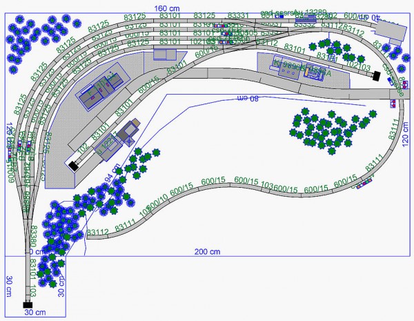 Upraveno na Jeňovo přání - vystačil jsem si s výhybkami, které má k dispozici. :) Celkem 3x EW2 levá, 4x EW2 pravá, 2x IBW levá (oblouková EW1), 1x EW3 pevná symetrická 12 st. Zbyla 1x IBW, tu je možné použít na vlečku, pokud bude zapotřebí druhá kolej k pile a jedna EW3, která mi nikam rozumně nezapadla. :)