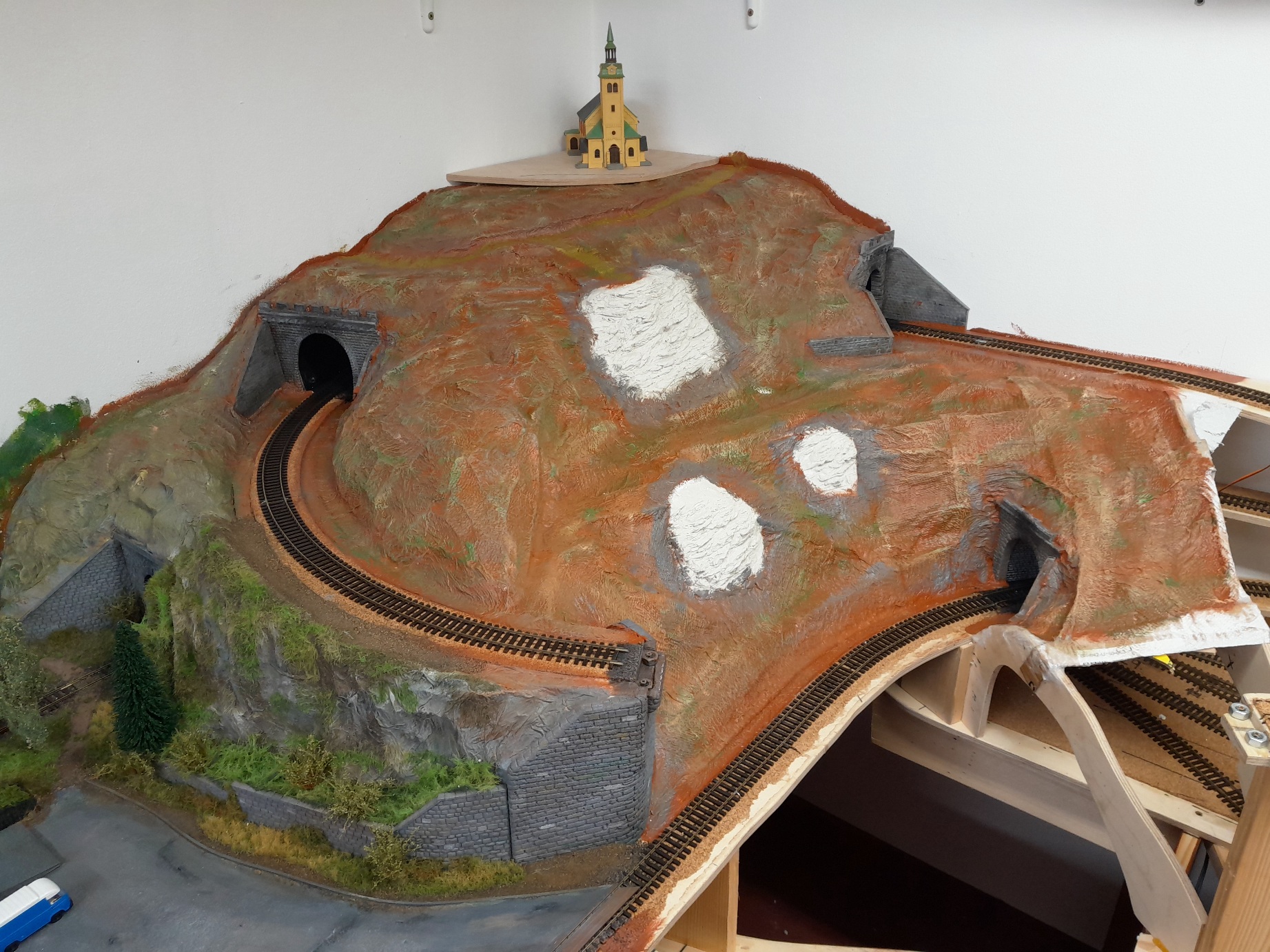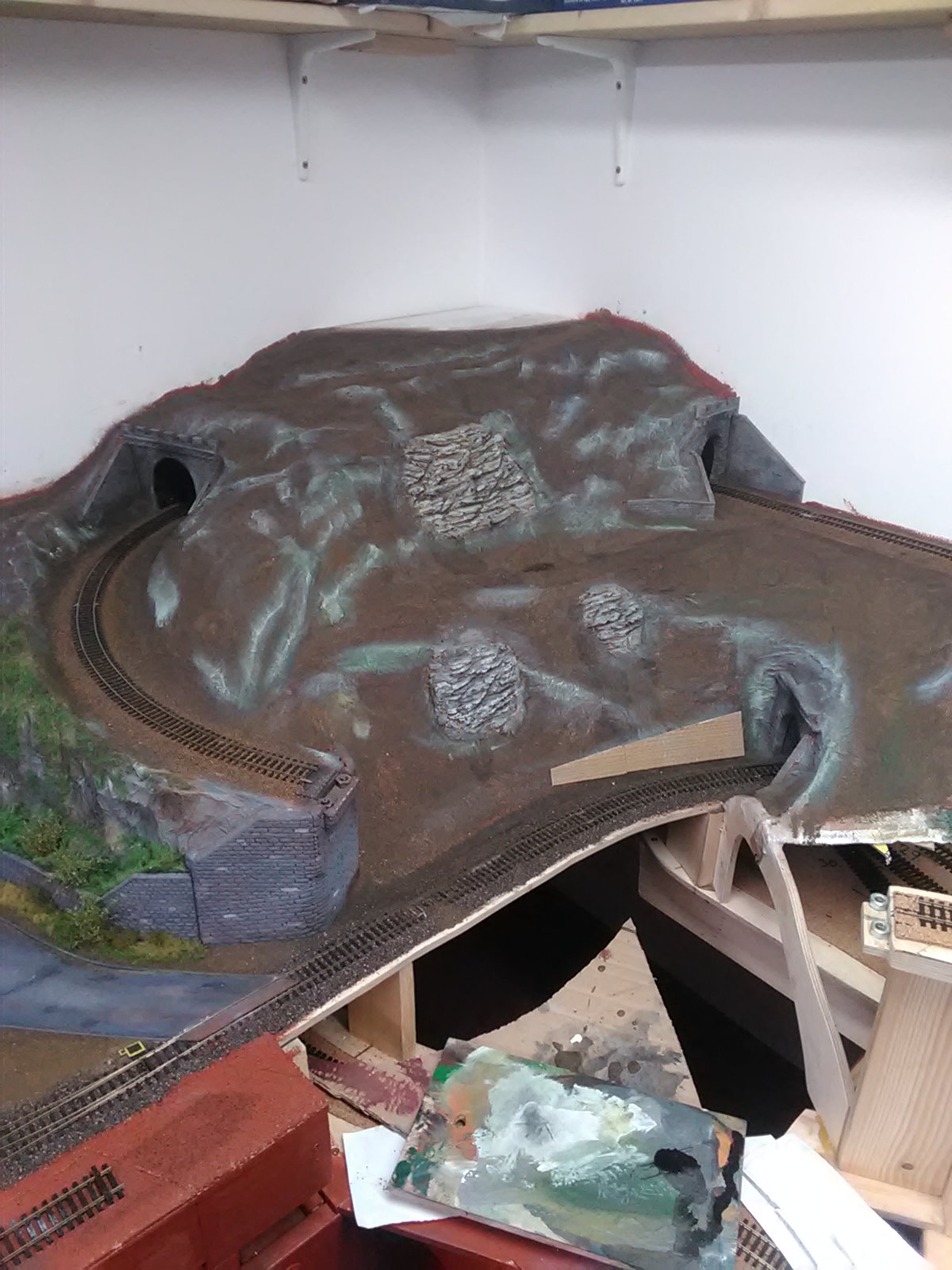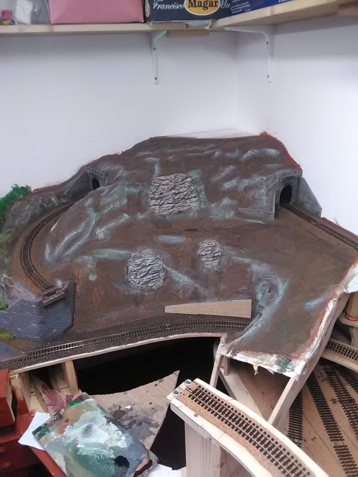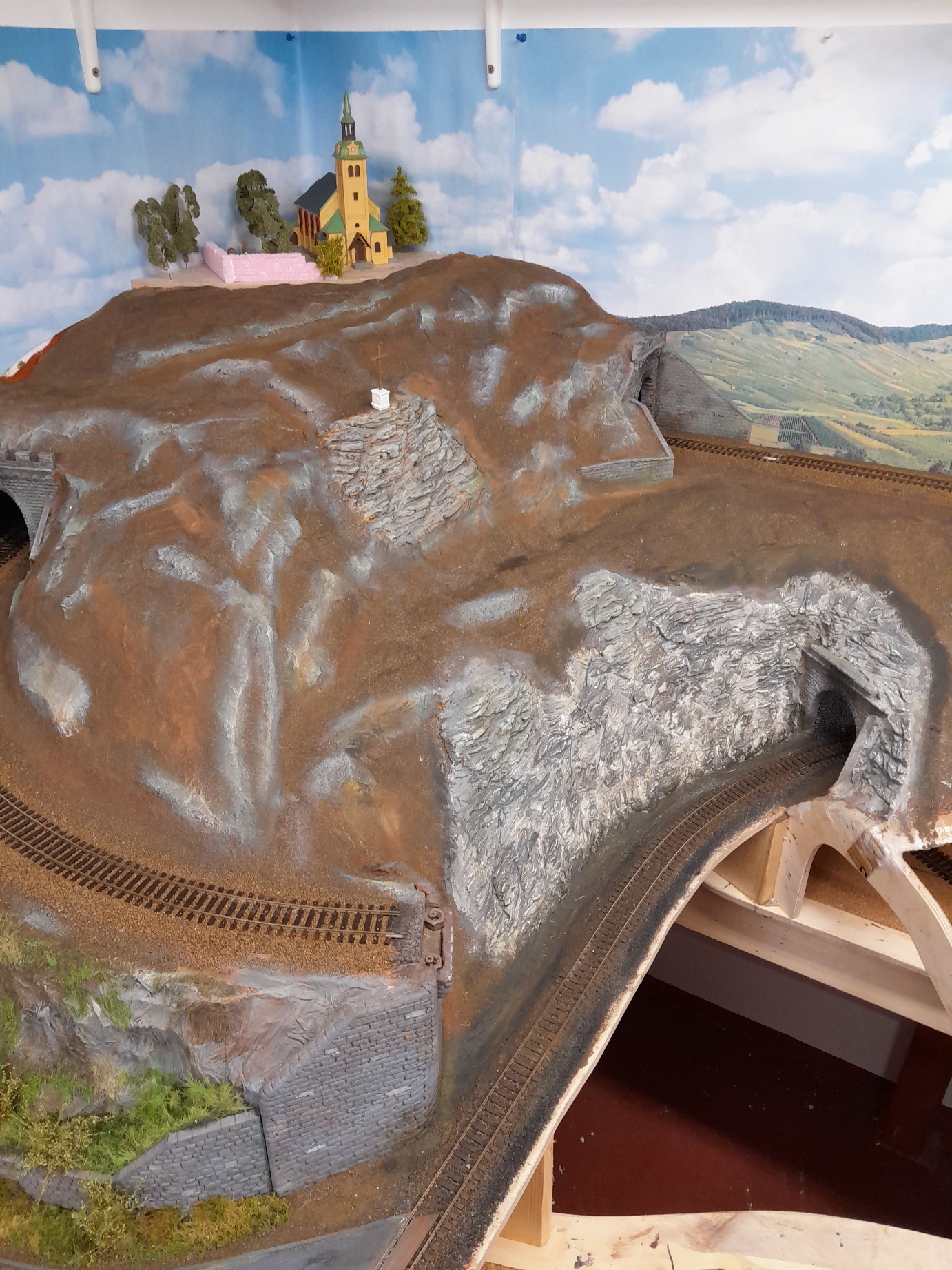 2.skaly na kopci je sadrova metoda a líbí se mi vic- zbytek kolejiště bude v tomto stylu.