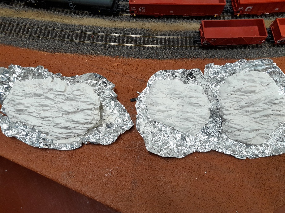 Dále jsem zkoušel z alobalu udělat formu na skály. Po vyndání se mi to moc nelíbilo tak jsem musel ještě doladit.