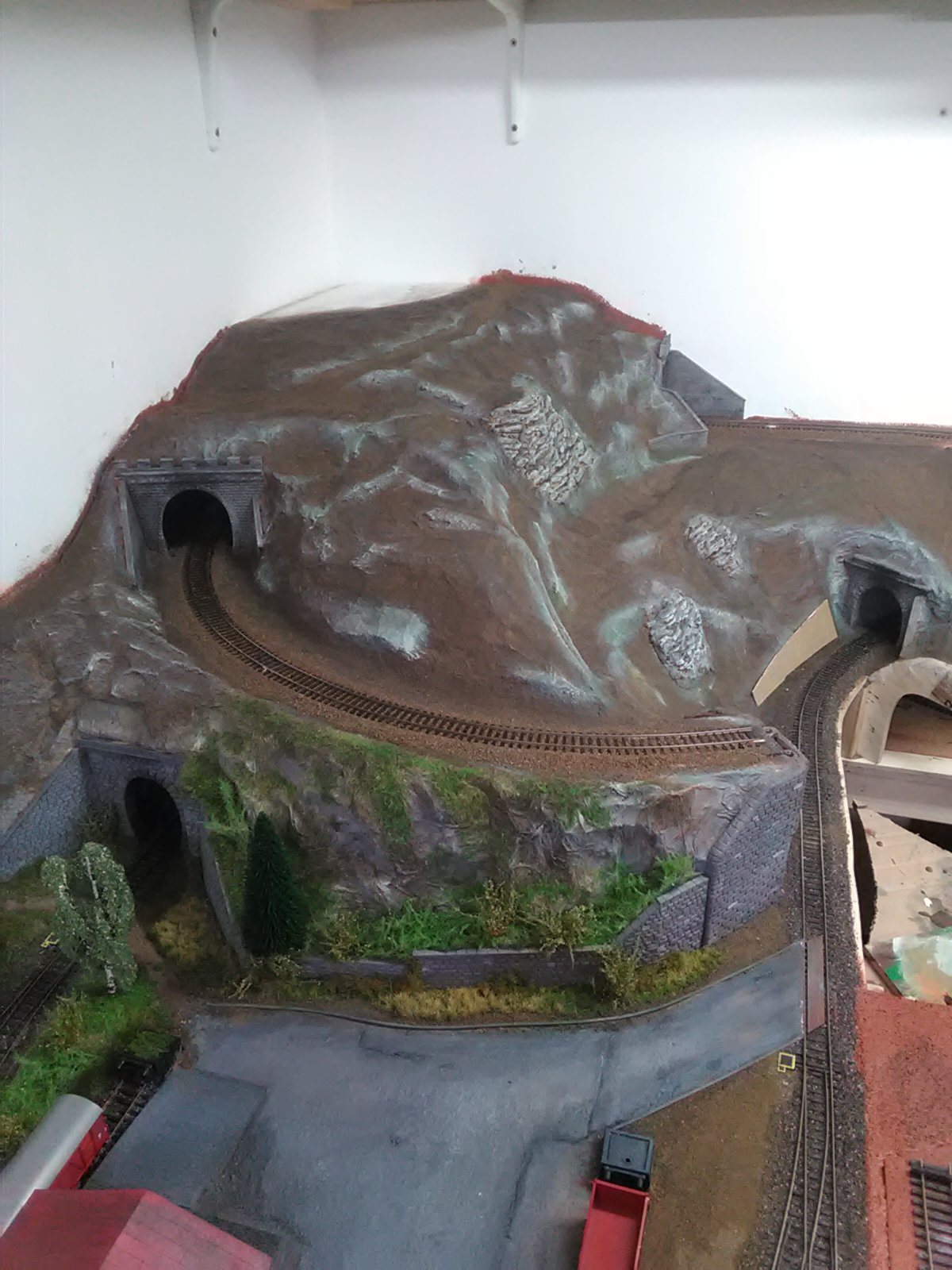 Spodní trať dobrý, vrchní-skála je pořád jako flek uprostřed svahu, kde takto být nemá. Znázornil bych ji jen u portálu kde máš tu opěrku jakoby od něj doleva, do "ztracena". Méně je více ....