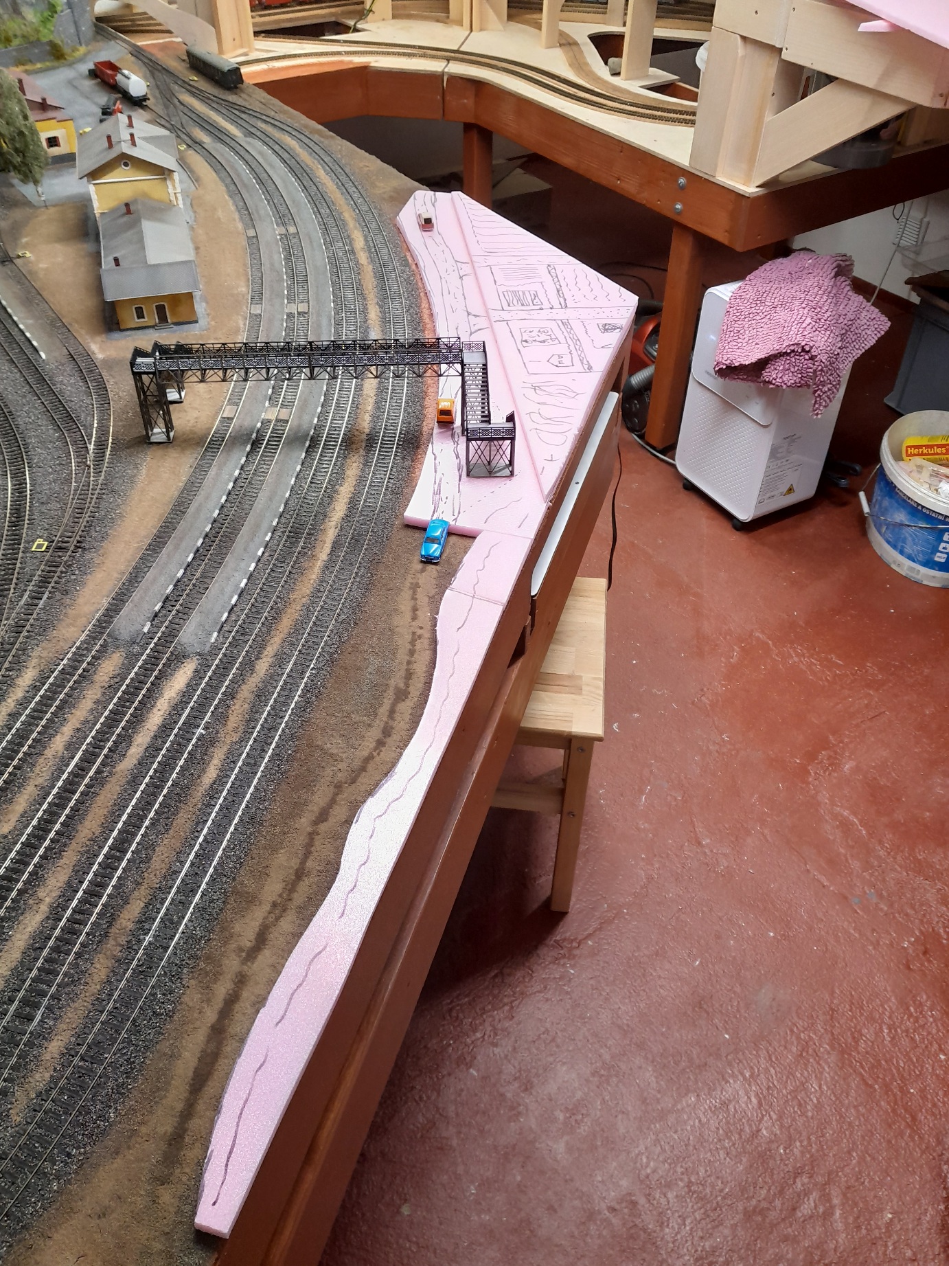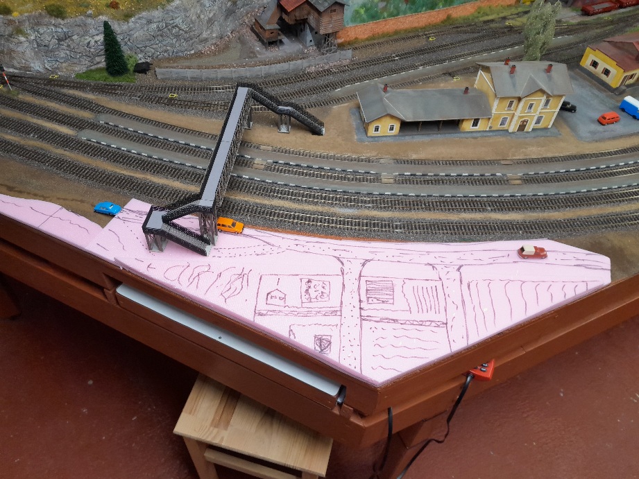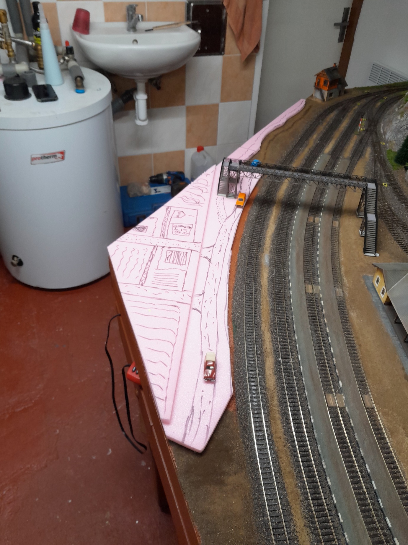 U pravého zhlavi je stará kolej na které bude v křoví usazen starý vagón že kterého roste naletove dřevina. Teď vše schne tak přemýšlím jak to vymyslet u lávky-viz nákres fixou....