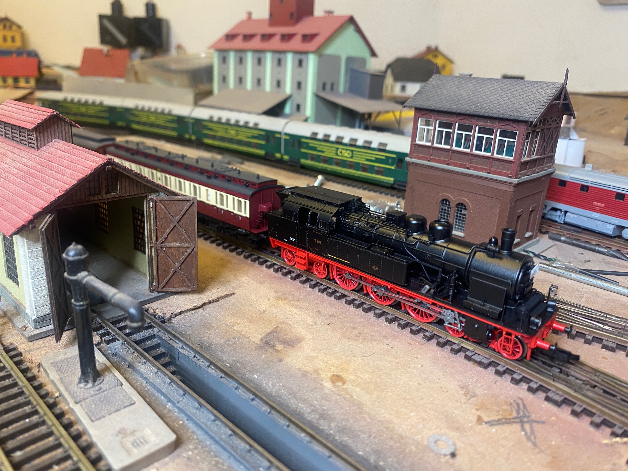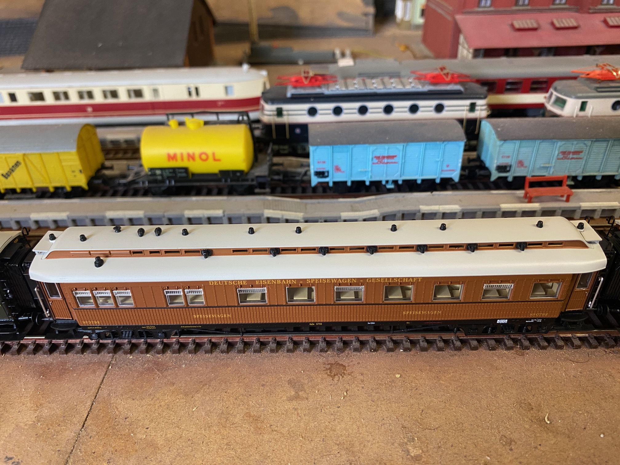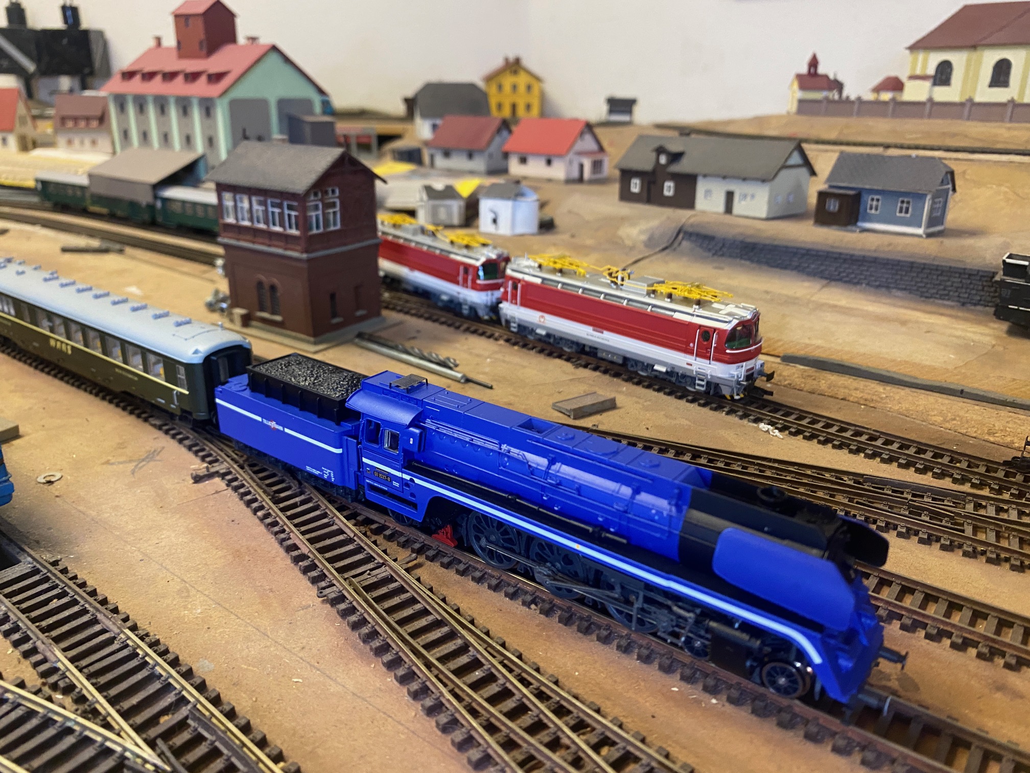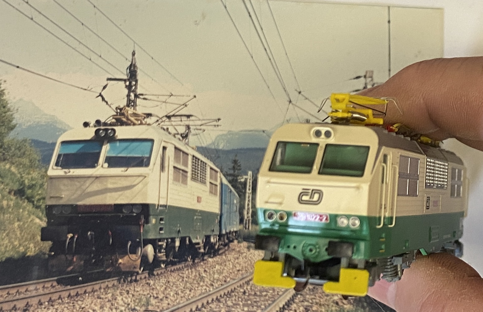 Nevím proč, ale tahle lokomotiva se mi vždy tvarem čela a zvláštně lomenými skly líbila, měl jsem jí v modré verzi jako malý kluk spolu s E44 v H0. Mám i její modrou verzi jako nějakou limitní skládačku, co kdysi byla a podařilo se mi to náhodou u nás zapadlé náhodou koupit. Když ještě nebyla v TT, upravoval jsem BTTB verzi z které je udělána na tuto, kdy jsem si sehnal z H0 verze předního okna a ty pokrátil, střechu prodloužil a tak nějak vypadala, ještě ji mám ve vitríně některých modelů nad kolejištěm. Kdysi tato vitriná bývávala určitou prostorovou dominantou obývacího pokoje u rodičů a tehdy to vypadalo moc hezky, dnes když jsou dané na stěnu a rozloženy na dvě části a jen viditelné z jedné strany, již to není ono. V mém mnohem větším životním prostoru se mi to prostě do interiéru tak nehodí a není to o tom, že bych já se musel doma doprošovat, takže skončily u kolejiště přišroubovány na stěně. Tehdy kdokoliv k nám přišel, obdivoval tuhle vitrínu, kolik jsem toho měl, když modely běžně nebyly dostupné. Tuhle na srazu to řešili kamarádi, že nechápali, kde jsem to vše bral a přitom to bylo jednoduché, ti co chodili za holkama a kouřili, potřebovali to z něčeho financovat a já to prostě jen koupil, takže mi to mnozí nabízeli.