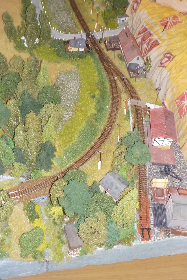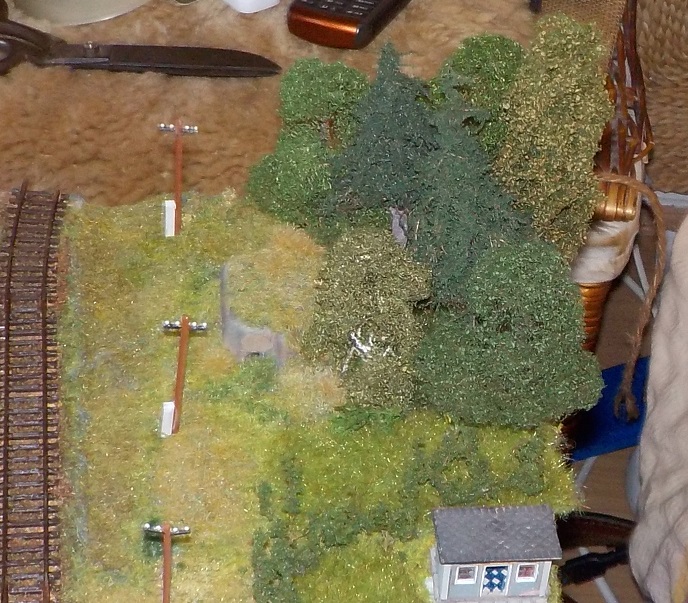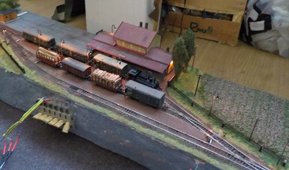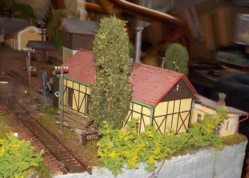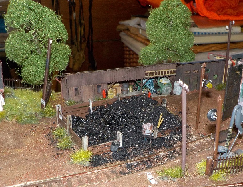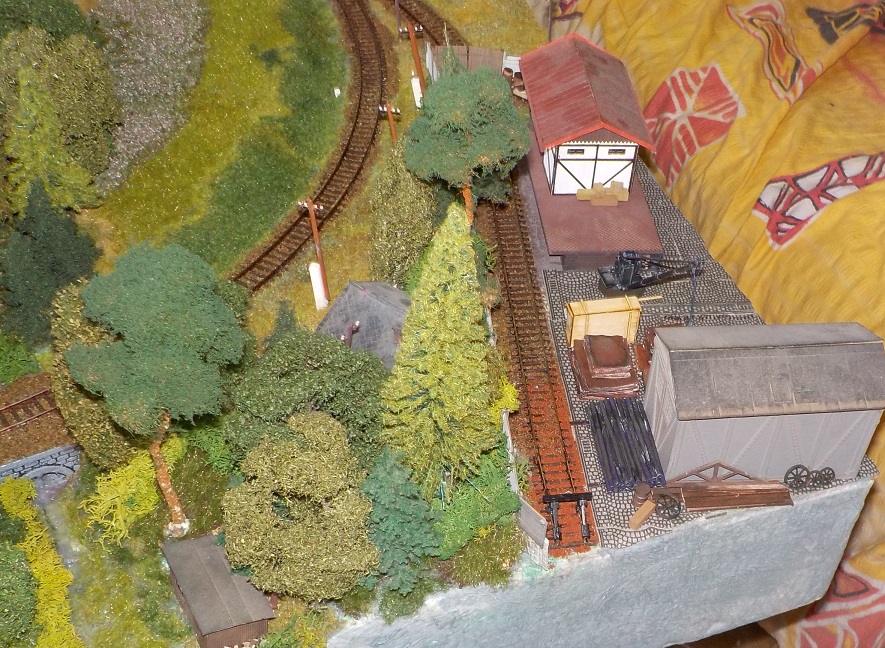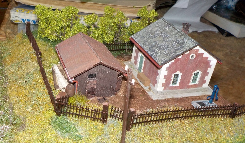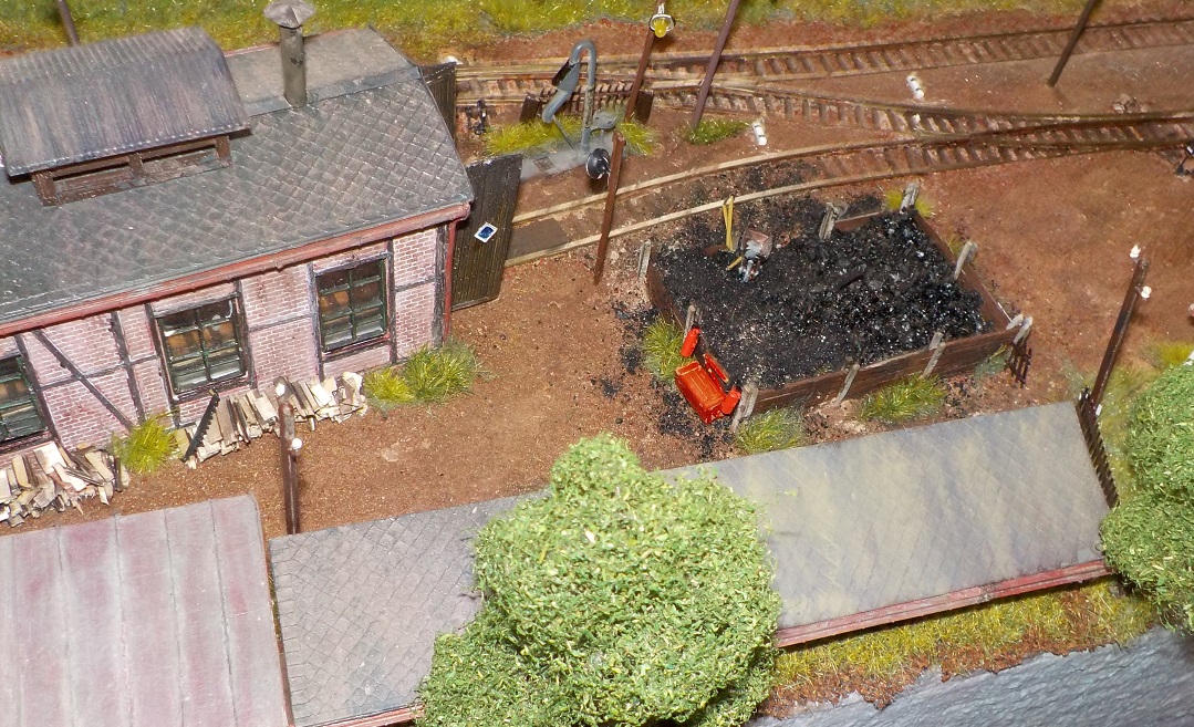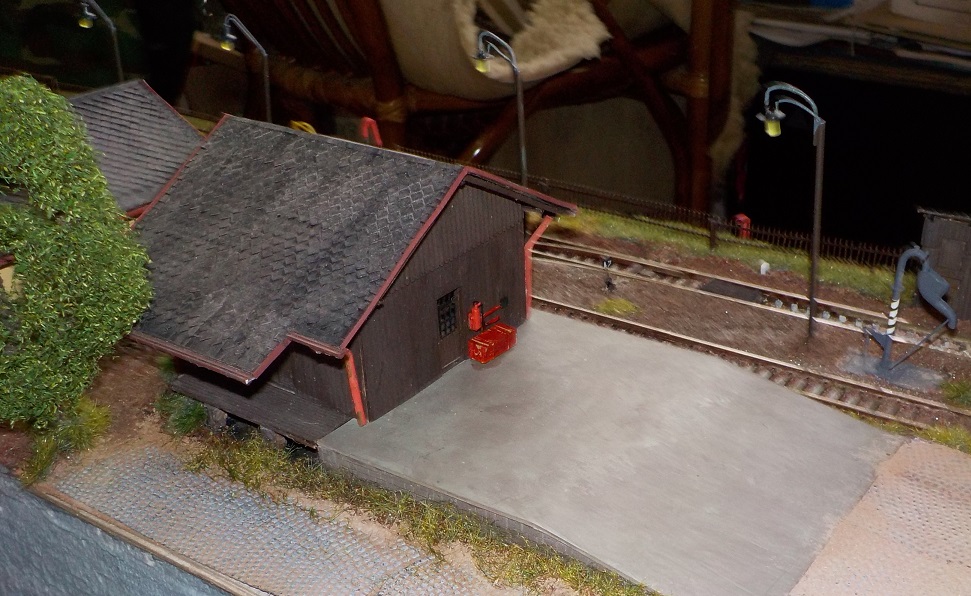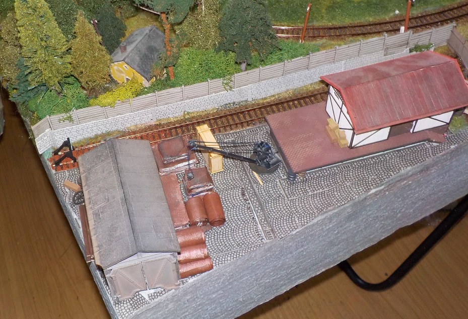 Kolem dřevěného skladu jsou použity zbytky vakuované dlažby od Malé železnice, kterou jsem před mnoha (cca 10) lety koupil na burze v Opletalce,a od té doby jsem je neviděl. Aršíky byly relativně malé a rozumně je napojit (bez příliš zjevných spár) byl problém, stejně jako jejich lepení do terénu. Ideální to bylo na malý diorámata, ty dlažky vypadaly opravdu dobře... Bohužel se s nima blbě dělalo.