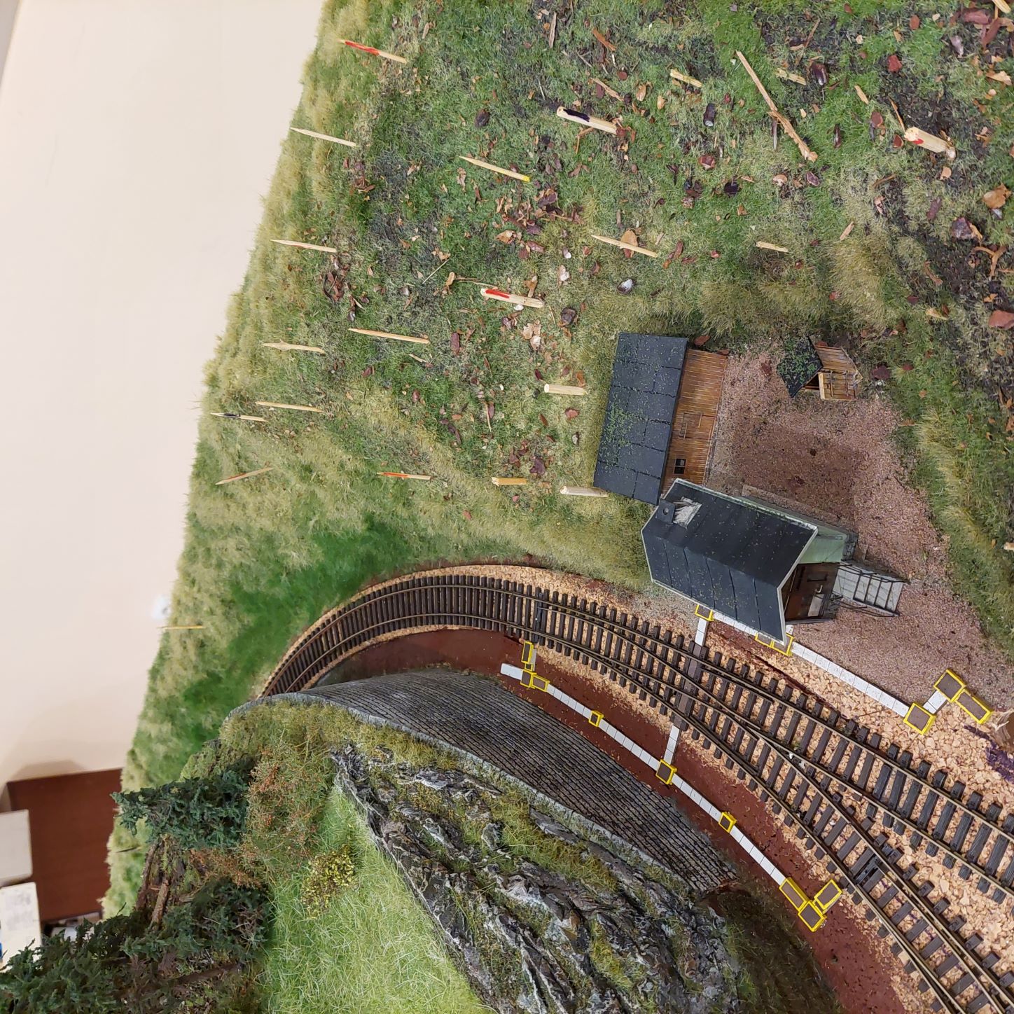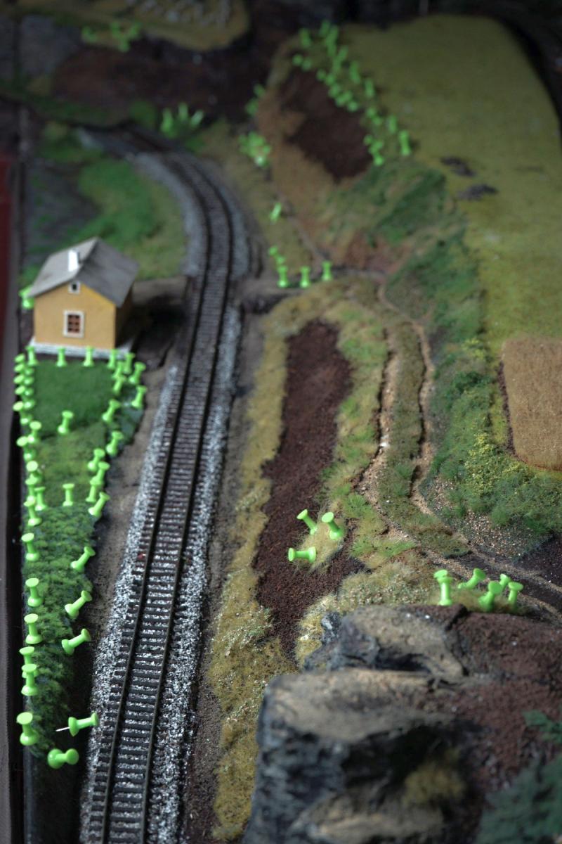 Nástin kde by měl být strážní domek u přejezu lesní cesty, sice na ten prostor asi nedostanu jeden z darovaných o kterém jsem původně přemýšlel, takže se asi bude muset vytvořit jiný o trochu menší, nebo ten zamýšlený trochu překopat...