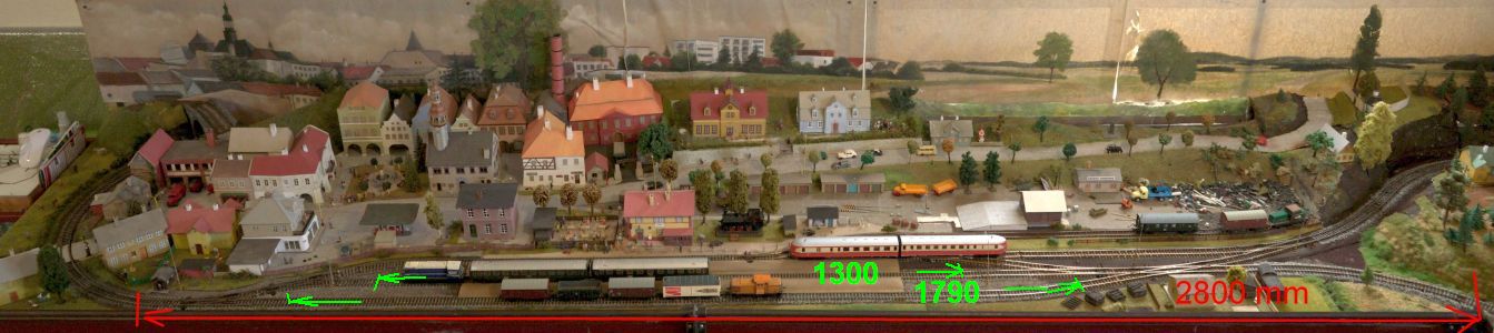 Stůl pod odbočnou stanicí má 3,2 metru, poloměr oblouku nalevo je zhruba 360 mm takže zbylá délka na panelu kde je nádraží i s kusem za ním je necelých 2,8 metru (takže kdyby to nebyla takto koncipovaná odbočná vešel by se tam nejspš oblouk další kdyby to bylo jen na jednom panelu), nalevo jsou vyhybky kratší s ostřejším odbočením, napravo jsou o něco delší... na nejdelší koleji je mezi námezníky necelého 1.8 metru, na dalších míň pokud nebudu chtít stát na vyhybkách...