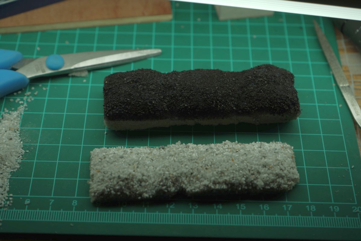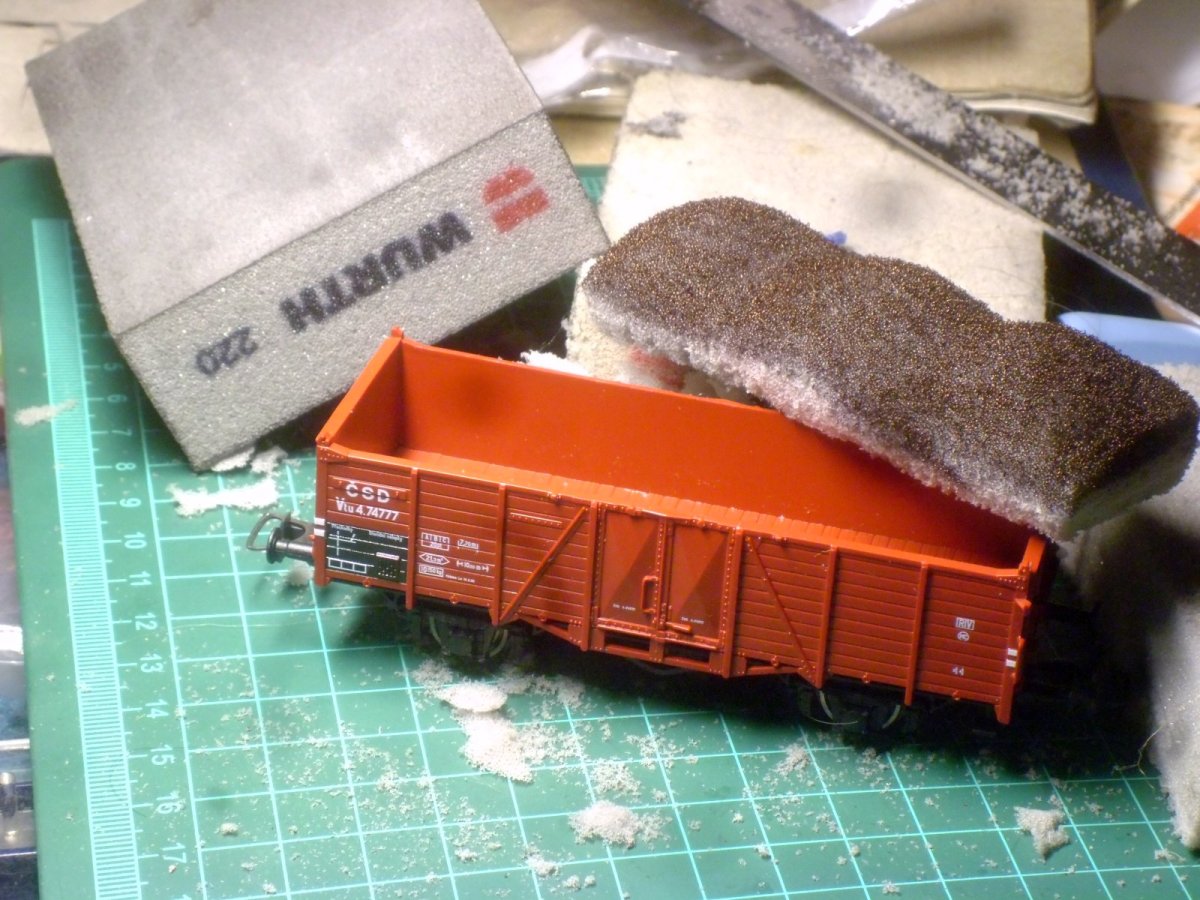 Jinak jde o obroušené brusné houby... není to molitam ale hutnější pěnová hmota, asi obdoba aranžovací hmoty co se dá sehnat v květinkce. Sice je to z houbiček trochu omezené velikostí ale na kratší vozy to i v H0 stačí, a dlouhé nemám. Seřízmu nahrubo tvar, nůžkami a šmirglem upravím, trochu probarvím podle toho co je za náklad, natřu lepidlem a posypu uhlím, štěrkem apod. tak aby to nebylo nalepené z boku a nedřelo bočnice, ale že to je v základu natřené tak neprosvítá světlá barva pod uhlím... Je to trochu poddajné a pružné sice ne jako molitan, ale stačí když se to udělá o kousek větší a ve voze to pak drží...