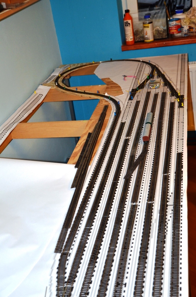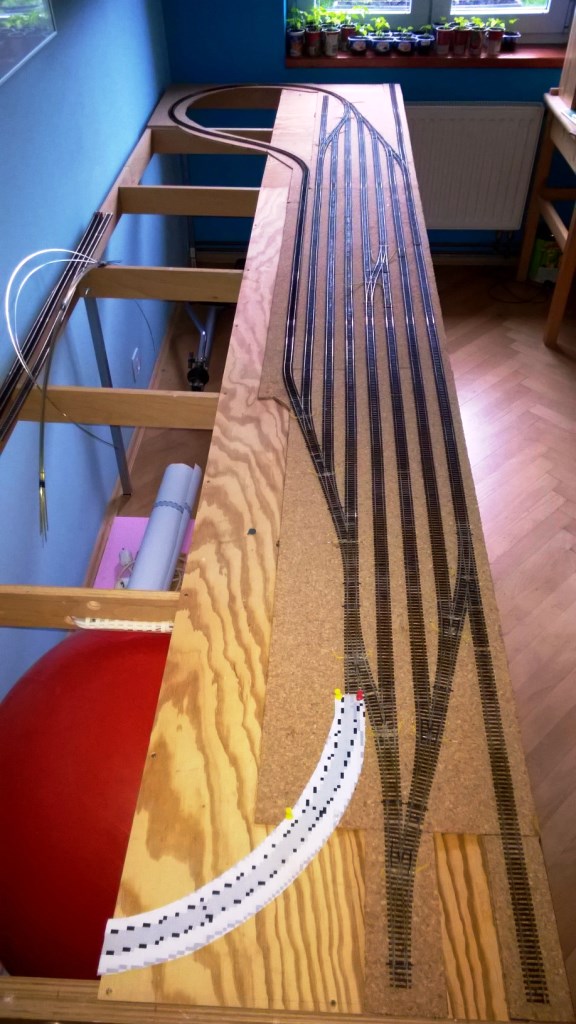 Po týdnu trochu posun vpřed. Dostavěny výhybky a tak jsou obě zhlaví kompletní. Hledání odpovědi na otázku, zda propojit některé koleje spojkami se pro tento týden dostala k jednoduchému řešení - jen jedna spojka ( je naznačena na fotce před vagóny).