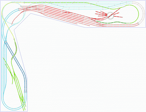 Edit: další verze, tentokrát s točnou a velkými oblouky na hlavní trati. Bohužel se to zkomplikovalo (tři úrovně nad sebou) a co hůř - nevychází výška na nadjetí hlavní trati lokálkou. Kdyby to vyšlo, už by stačilo jen koncové nádraží na lokálce a hotovo. Chce to ale nějak poštelovat ...