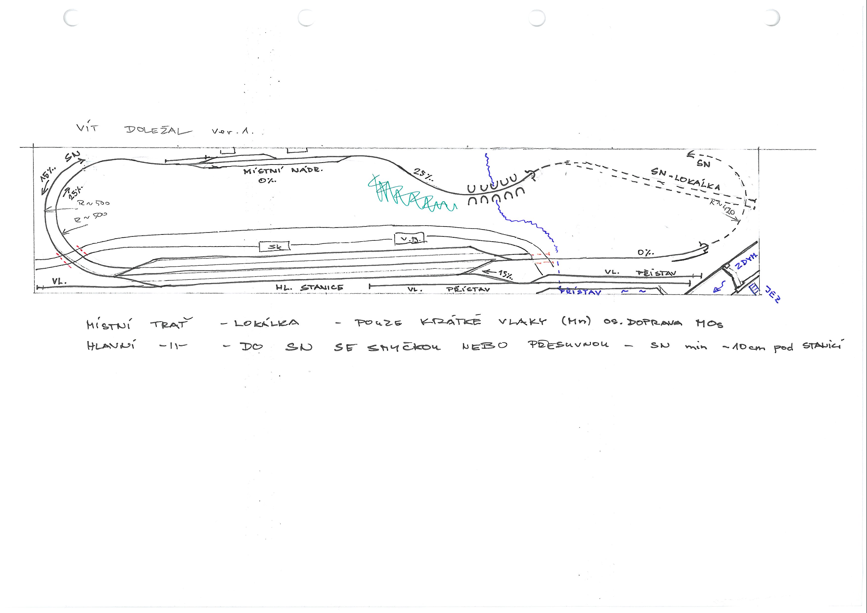 Nevím jestli to chápu dobře, ale trať která vede od nádraží do tunelu pod zdymadlo vyjede z tunelu před mostem? Tam, ale přeci z podzdymadla nestihne nastoupat na most. Proto jsem myslel, že trať zůstane na úrovni spodní hladiny a přístavní koleje musí být nad hladinou stejně tak lokálka, která bude ze stanice pozvolna stoupat na most. Bohužel neumím ještě pracovat s vrstvy, tak se mi to blbě vysvětluje. Tady je poslední úprava, nádraží je samozřejmě možné rozšířit. Jinak délka je myslím dostačující. Ale děkuji za snahu, cením si toho.