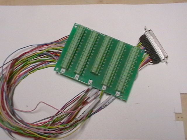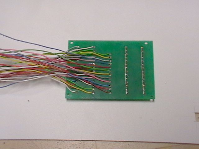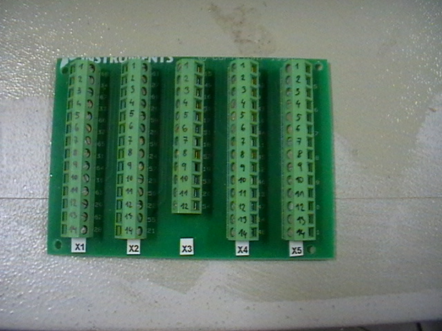 Zespoda jsou kablíky přiletovány k jednotlivým svorkám. Není tedy třeba používat nutně plošný spoj. Tyhle svorky jdou běžně koupit a lze je vetknout do děrovaných plošáků, které se prodávají. Přitom není vůbec nutno nějak řešit plošný spoj. Každý vodič jde z konektoru na jednu svorku. Takto jsem obsadil tři svorkovnice. Zbylé dvě jsem pospojoval a budou použity jako sběrné.